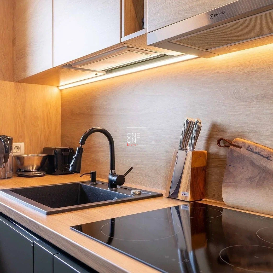 В качестве цветового решения была выбрана трендовая комбинация графитово-серых фасадов с текстурой дерева. Четкие линии темных фасадов без ручек в сочетании с теплой подсветкой создают контраст между современностью и теплом природы, а текстура дерева добавляет интерьеру натуральности и глубины.