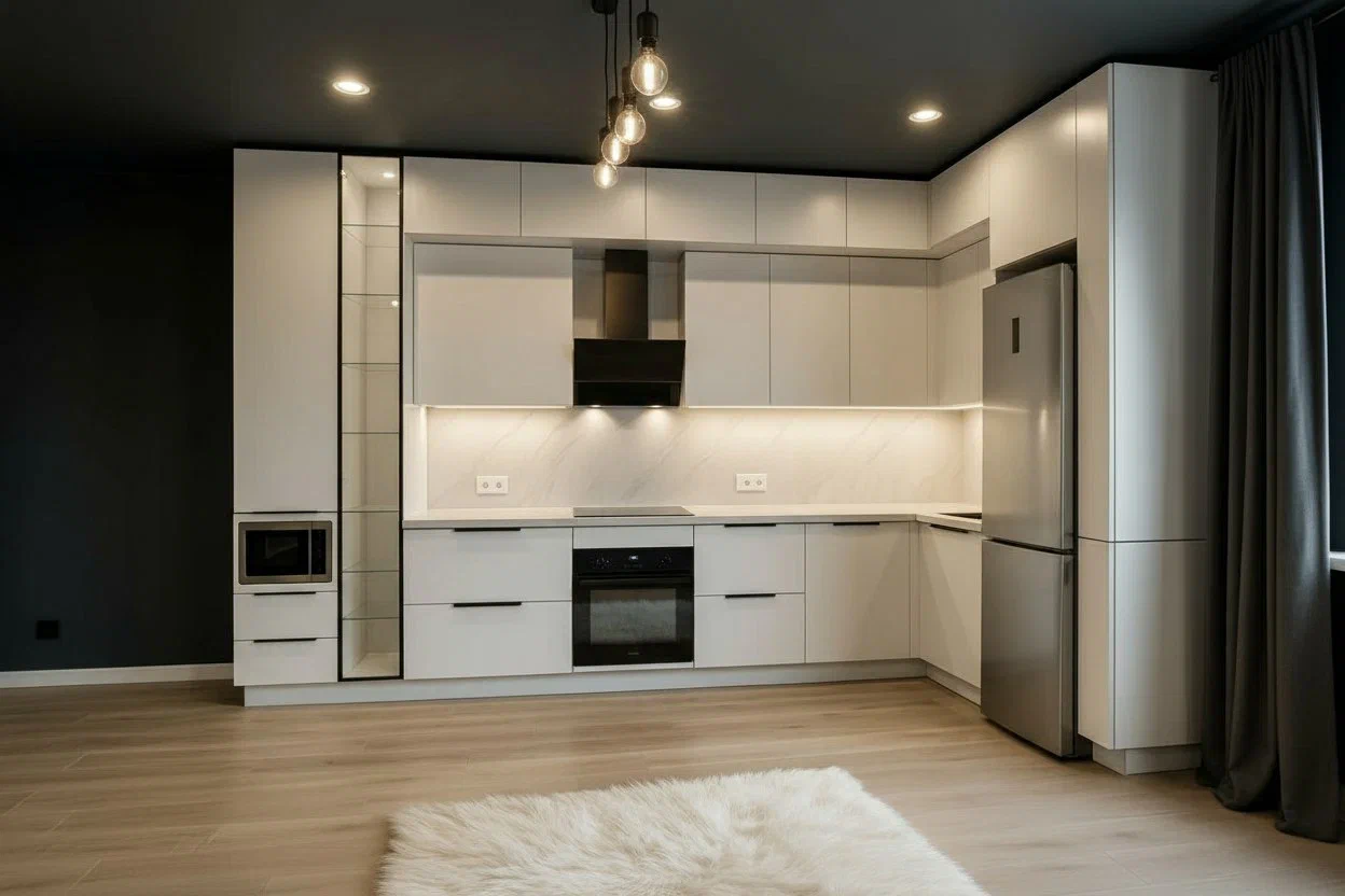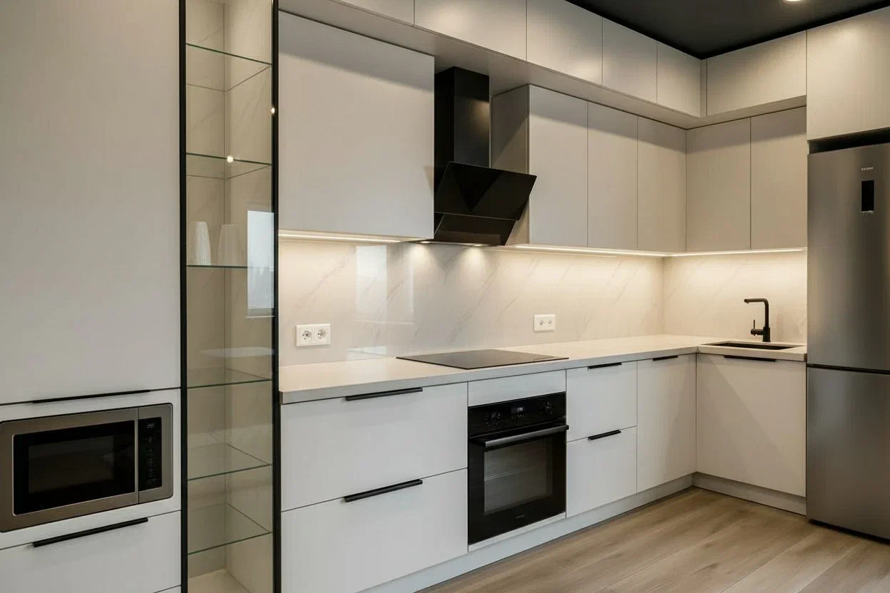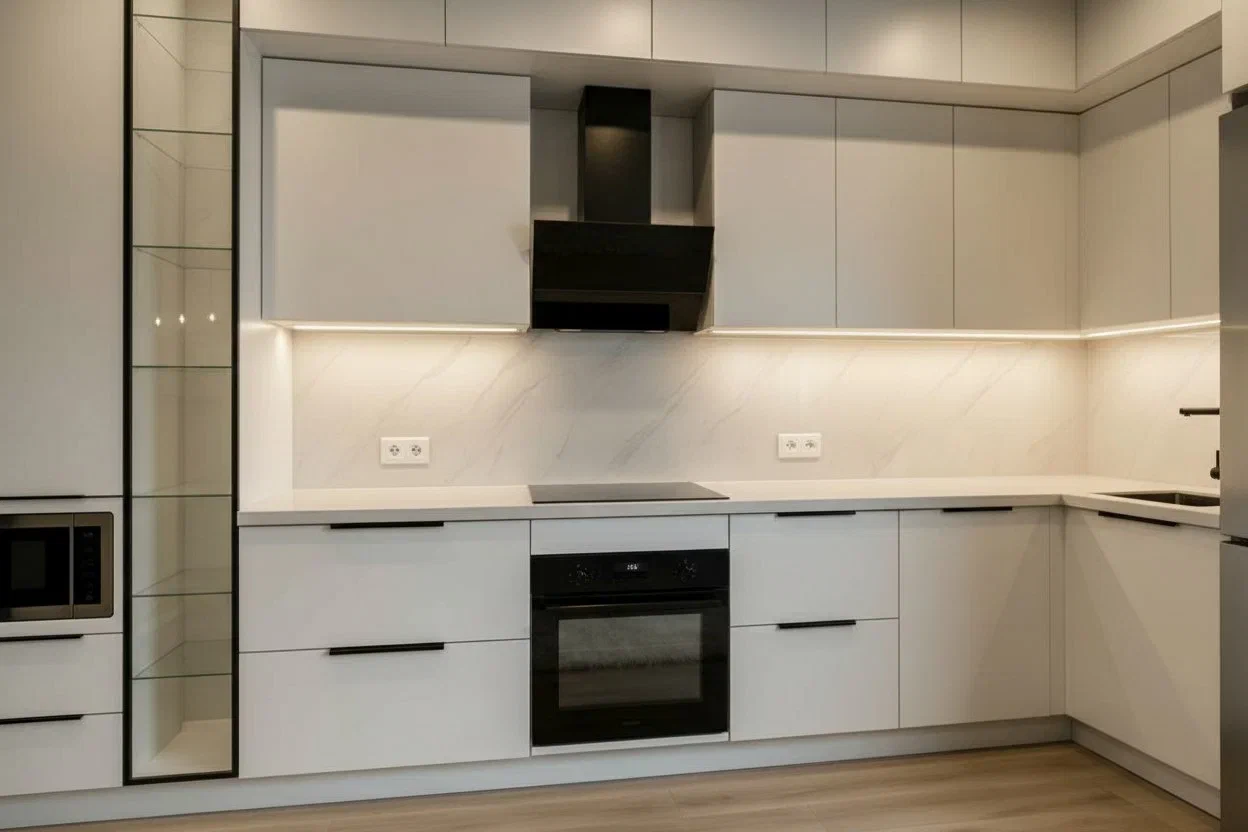 Светлая кухня в чистом белом оттенке с лаконичными чёрными акцентами. Фасады МДФ Kastamonu и корпус Увадрев Белый гармонично сочетаются со столешницей из акрила Grandex Arezzo, создавая лёгкий и современный интерьер.