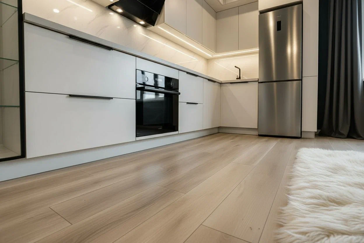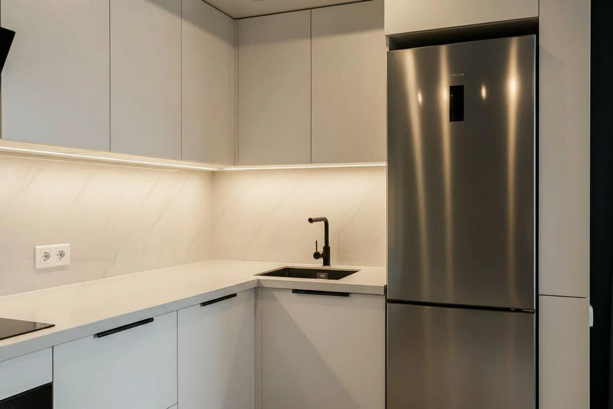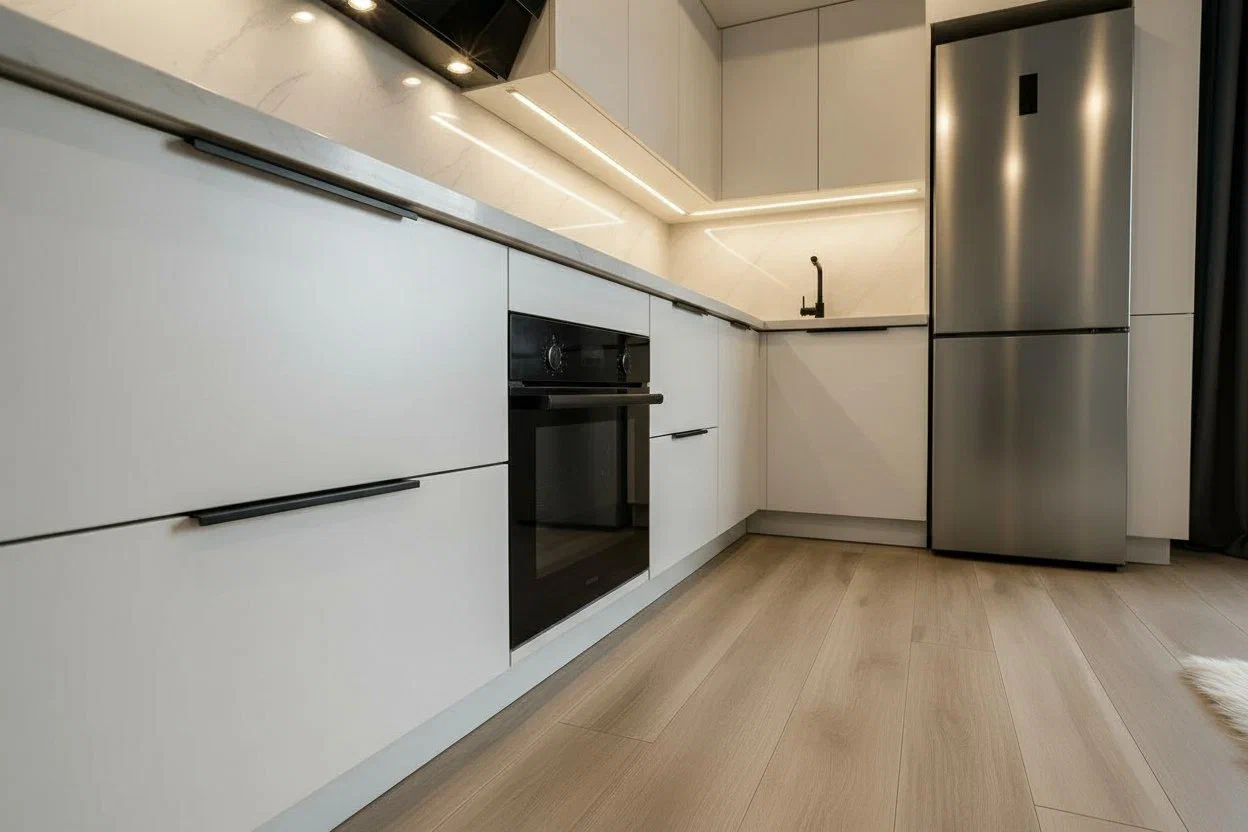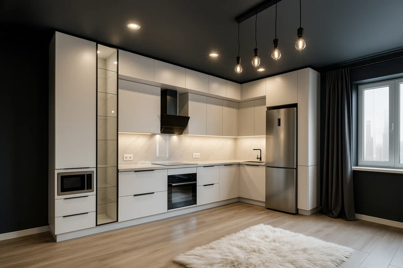 Светлая кухня в чистом белом оттенке с лаконичными чёрными акцентами. Фасады МДФ Kastamonu и корпус Увадрев Белый гармонично сочетаются со столешницей из акрила Grandex Arezzo, создавая лёгкий и современный интерьер.