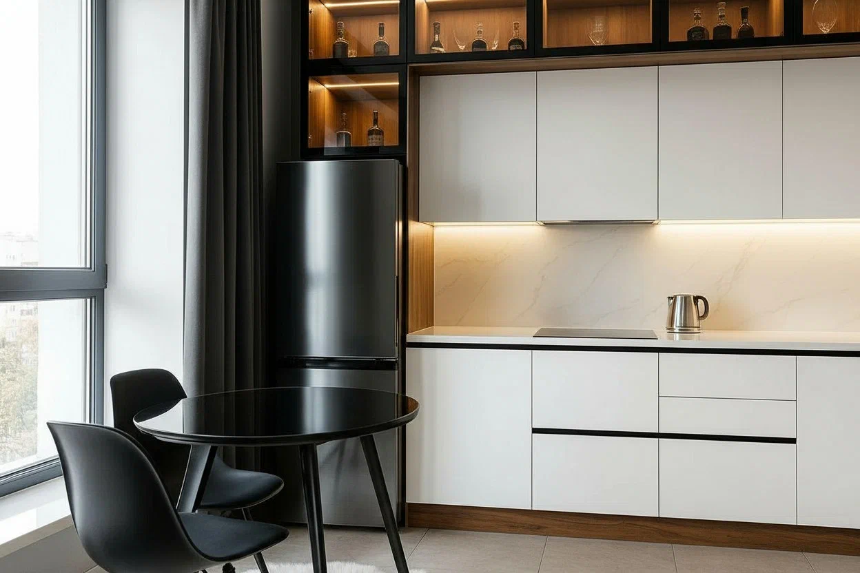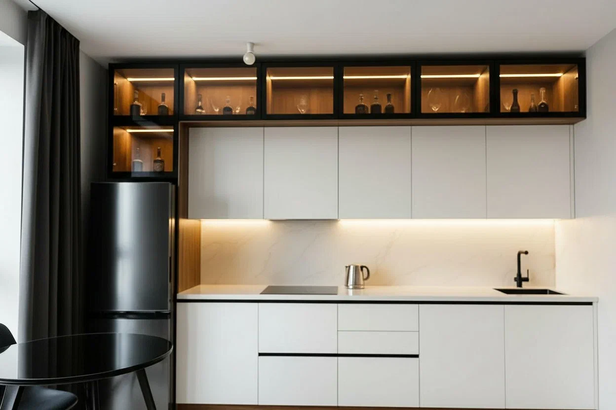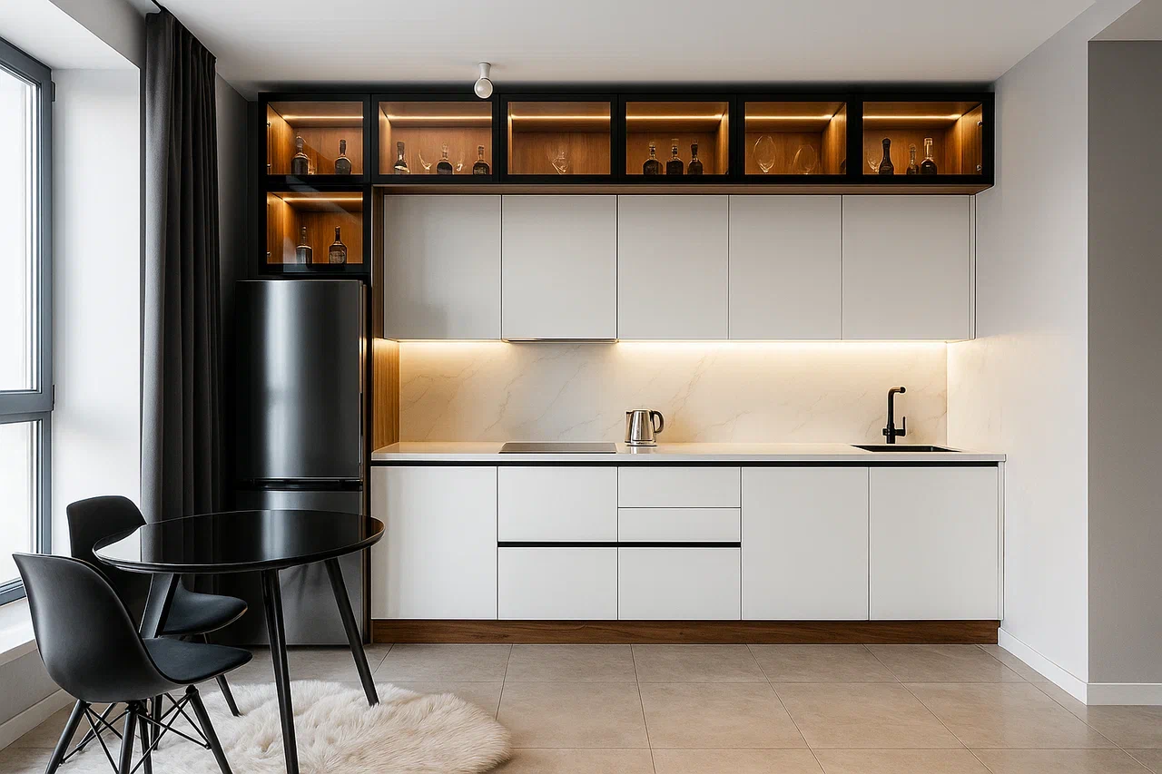 Фурнитура Boyard EVO с выкатными механизмами Тандембокс обеспечивает плавную и надёжную работу шкафов. Кухня дополнена чёрной стальной мойкой подстольного монтажа, смесителем и подсветкой витрины и рабочей зоны для комфорта и стильного акцента.