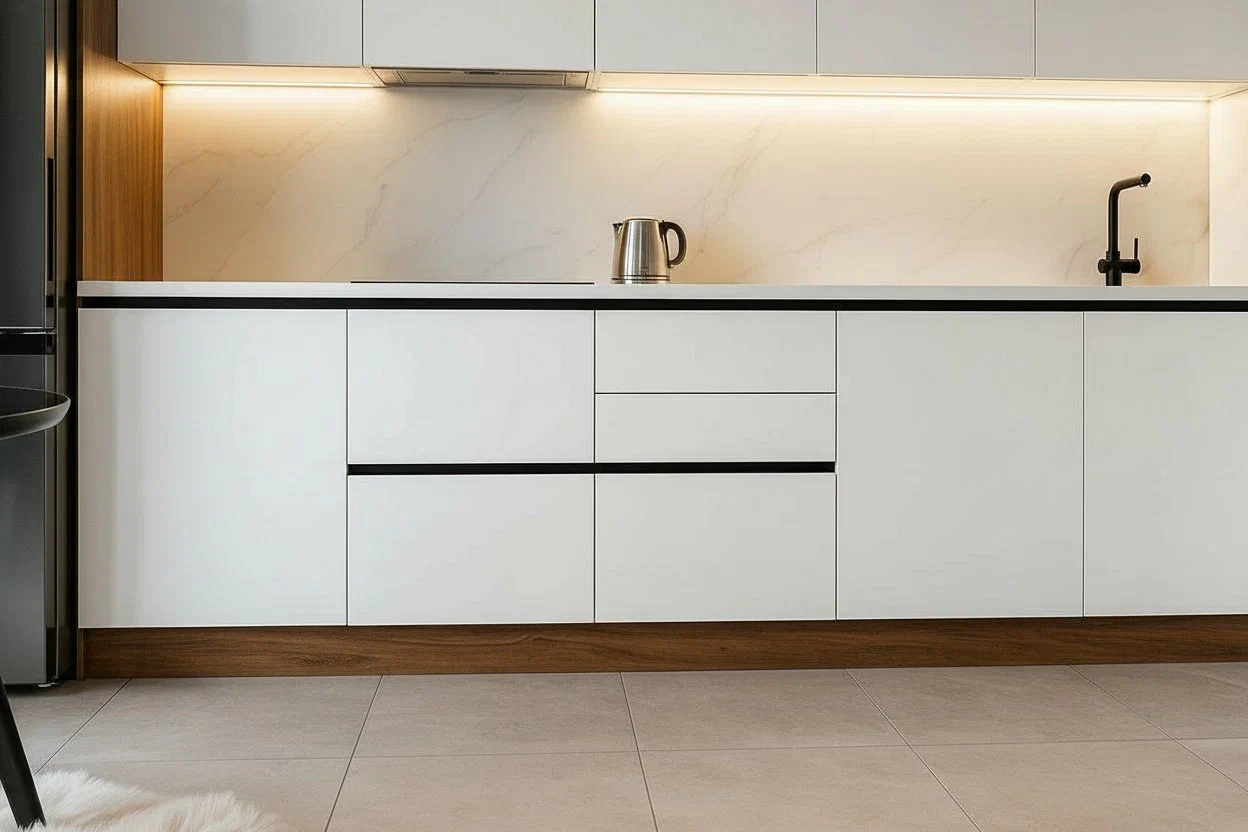 Контрастная кухня в белом цвете с тёплым древесным акцентом. Фасады МДФ Kastamonu в белом оттенке сочетаются с корпусом Egger Дуб Каселла Каштановый и столешницей из акрила Grandex Marble Mirage, создавая выразительный и сбалансированный интерьер.