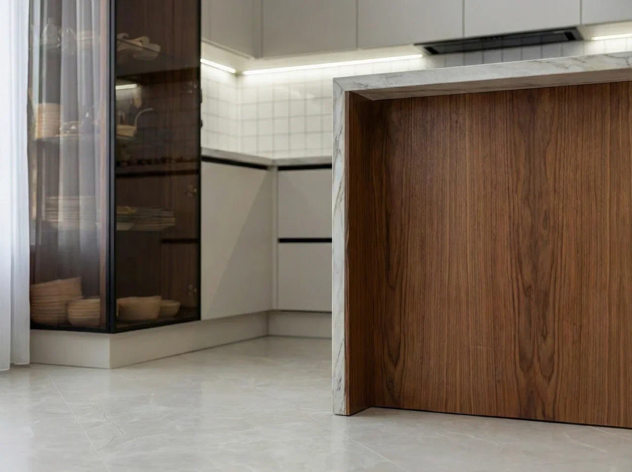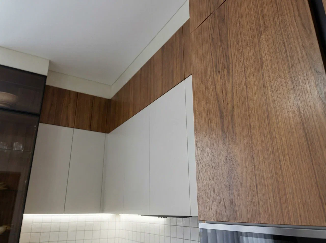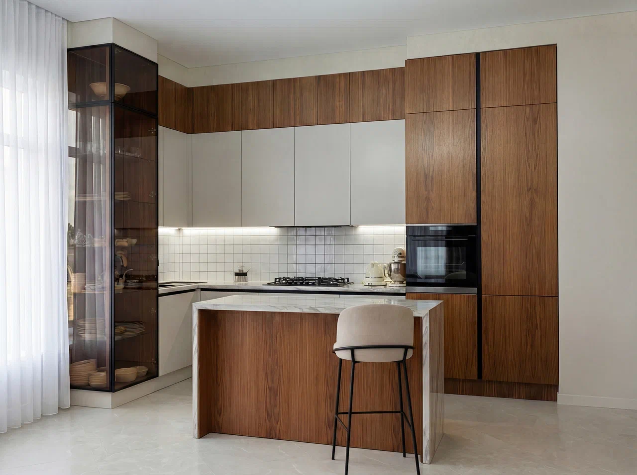 Фурнитура Boyard EVO со скрытыми выкатными механизмами обеспечивает плавное и надёжное открытие шкафов. Кухня дополнена чёрной стальной мойкой, смесителем и подсветкой витрины для функциональности и атмосферного акцента.