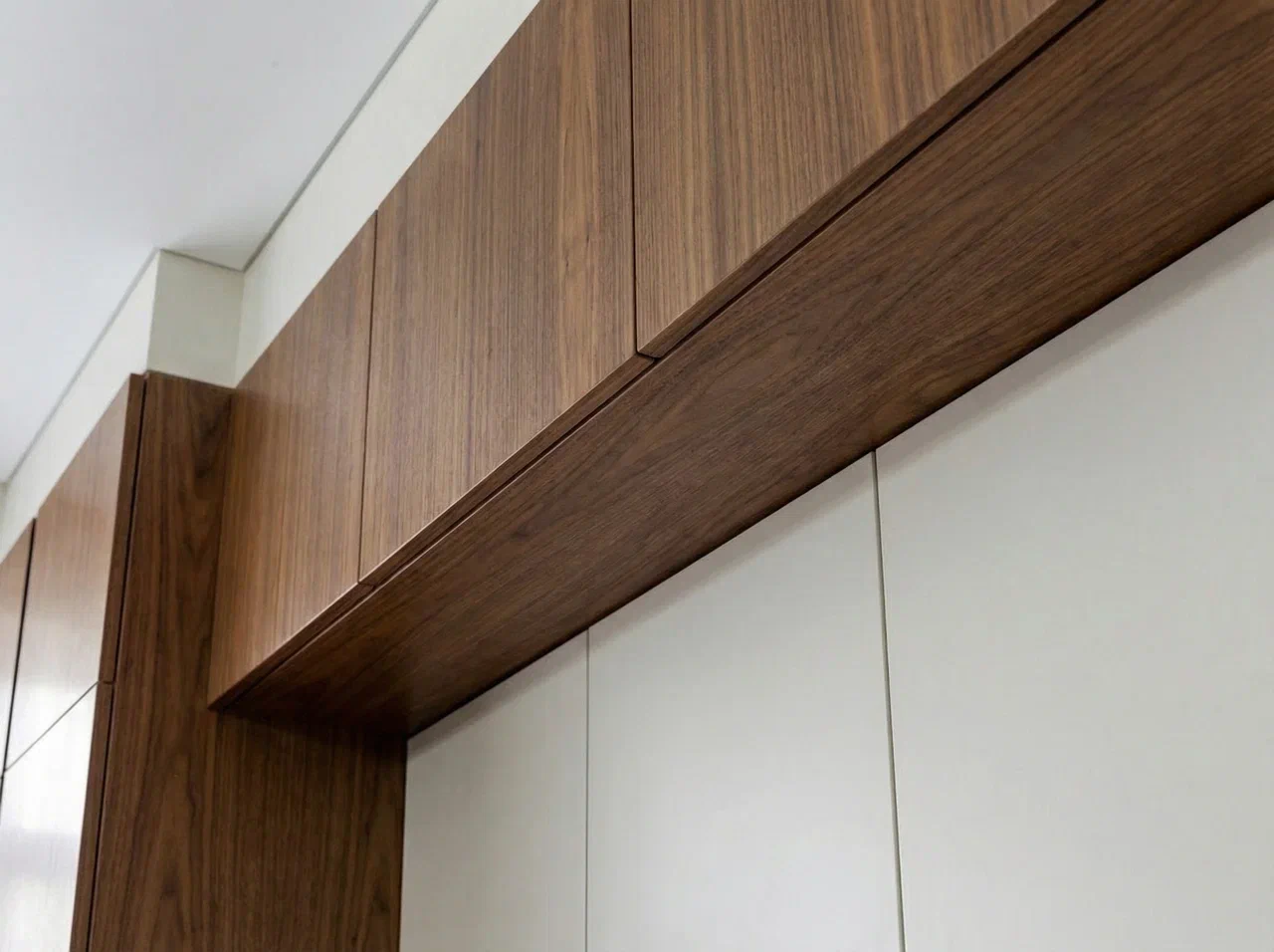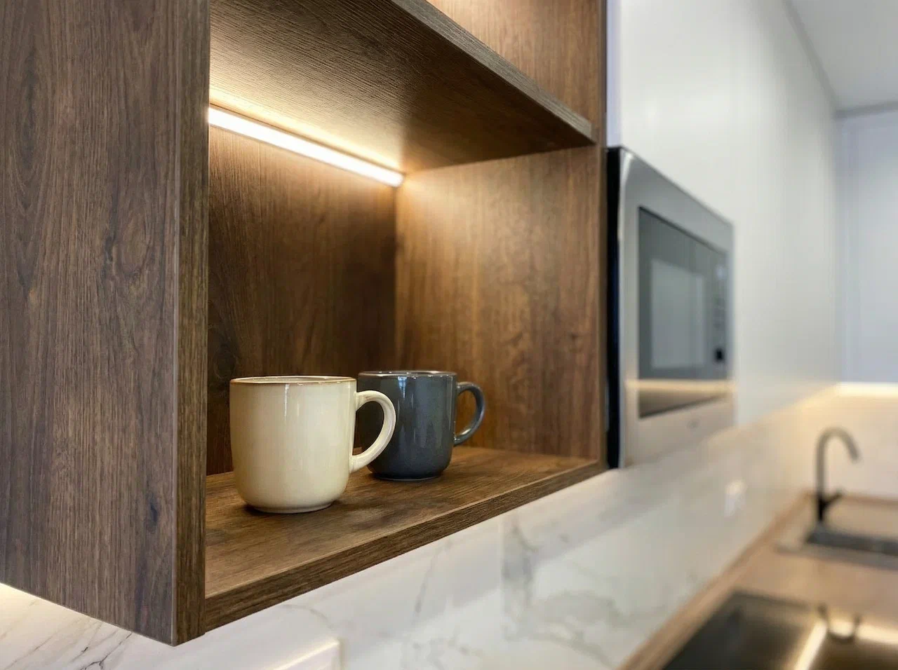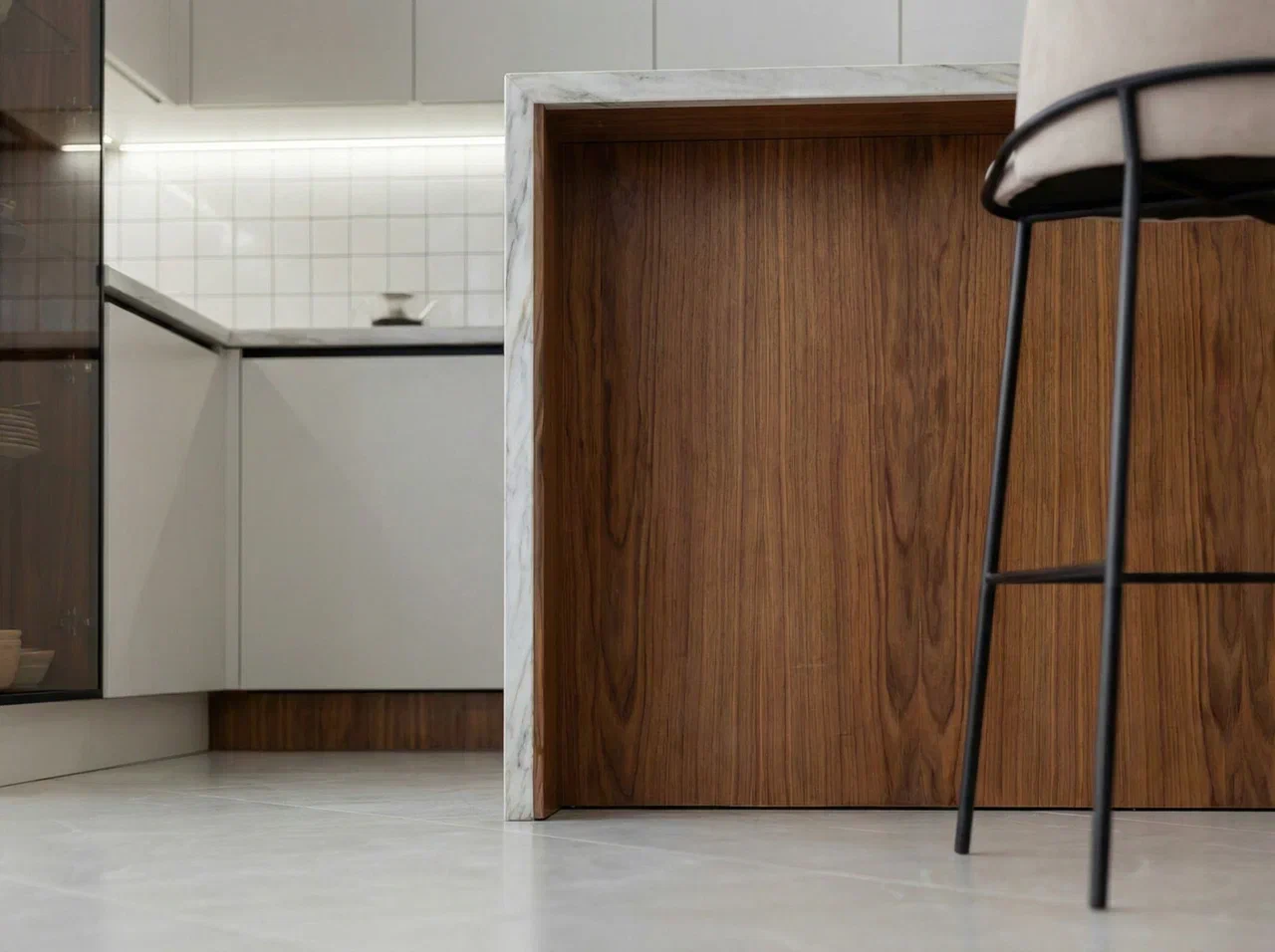Фурнитура Boyard EVO со скрытыми выкатными механизмами обеспечивает плавное и надёжное открытие шкафов. Кухня дополнена чёрной стальной мойкой, смесителем и подсветкой витрины для функциональности и атмосферного акцента.