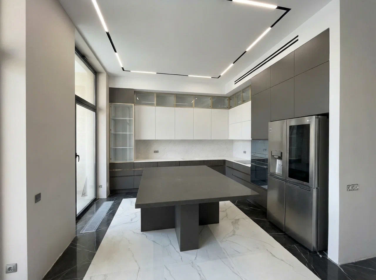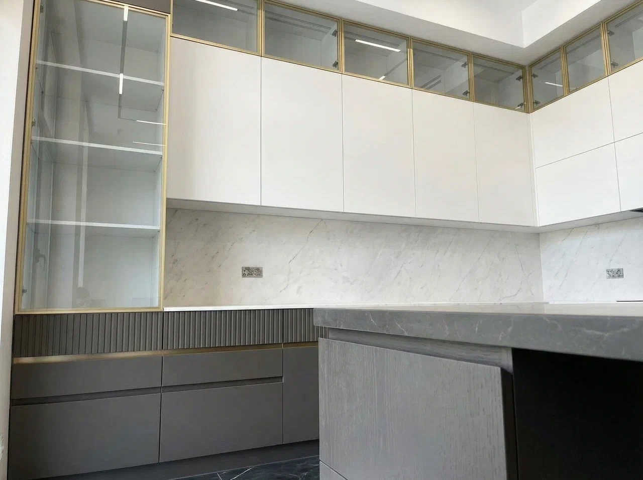 Контрастная кухня в сочетании оттенков Шарли графит и Шарли белый с выразительными золотыми акцентами. Фасады МДФ Kastamonu и корпус Увадрев в графите и белом создают динамичную композицию, а столешница Скиф «Аргус Светлый» добавляет светлый натуральный акцент.