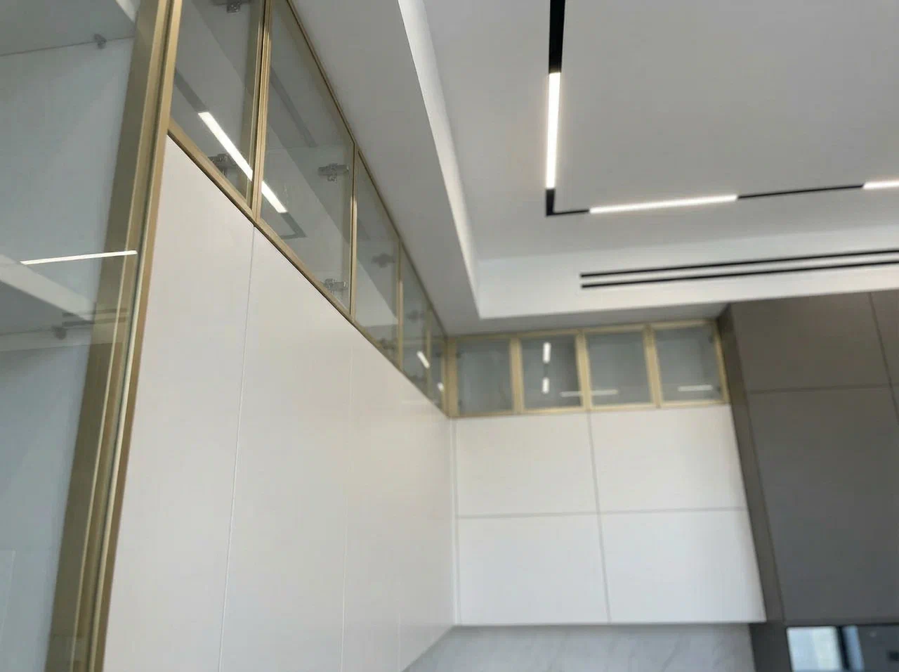 Золотой профиль Gola и тонкая алюминиевая рамка подчёркивают элегантность и придают интерьеру изысканный характер, а прозрачное стекло сохраняет лёгкость витринной зоны.