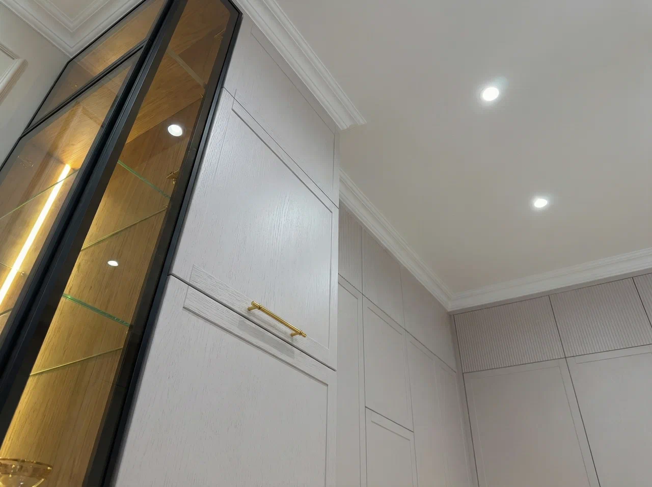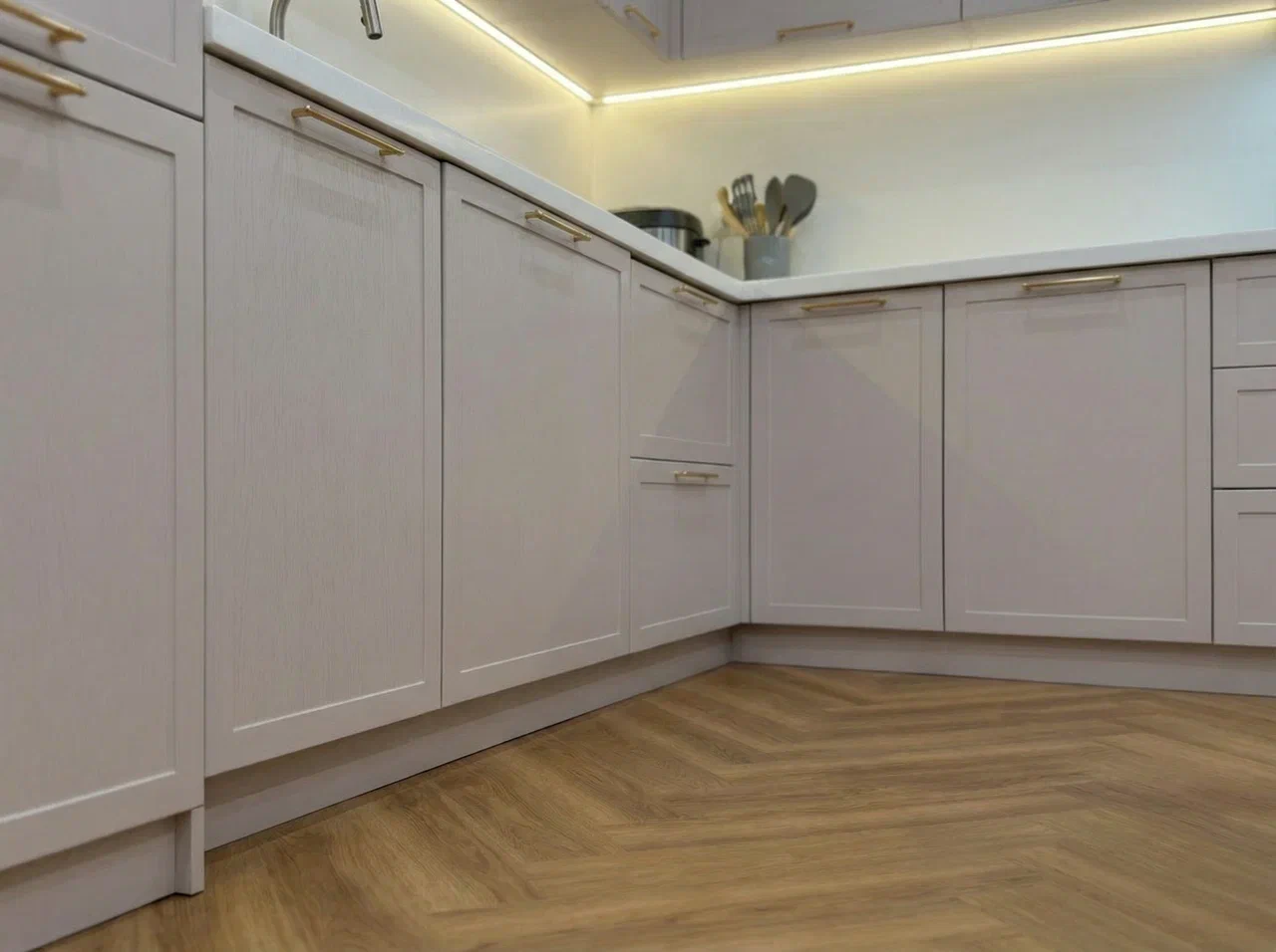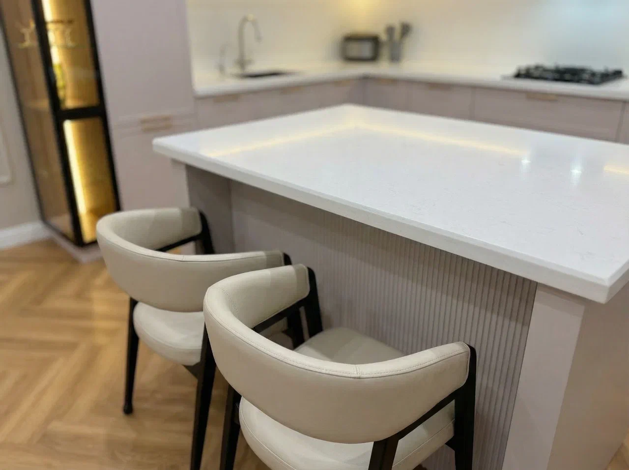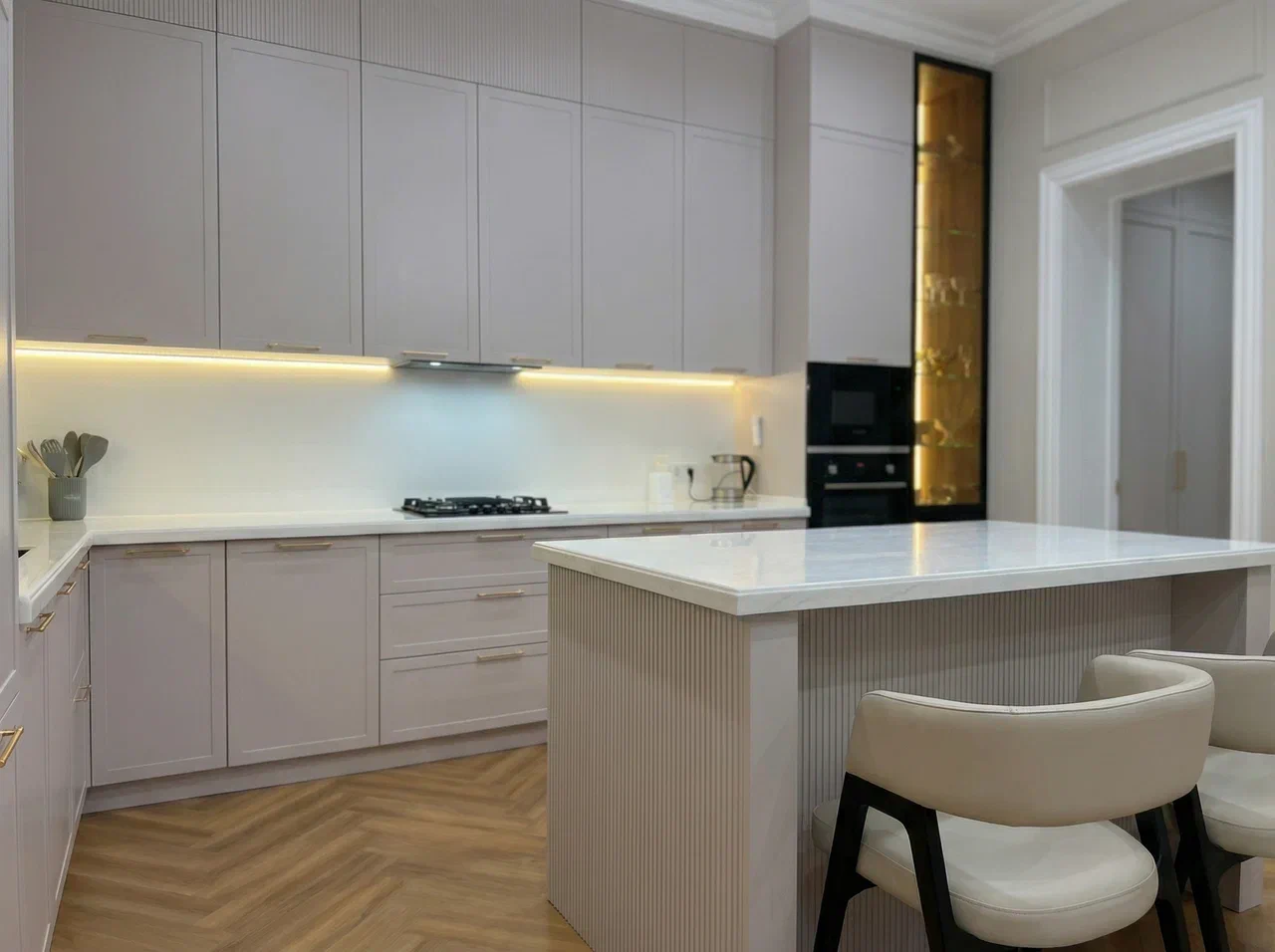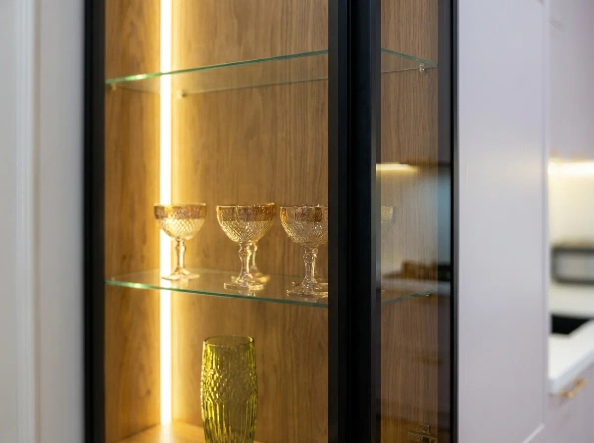 Фурнитура Firmax с выкатными механизмами Тандембокс обеспечивает плавное и тихое открытие шкафов. Кухня дополнена подсветкой витрины и рабочей зоны, создающей комфорт и эффектный визуальный акцент.