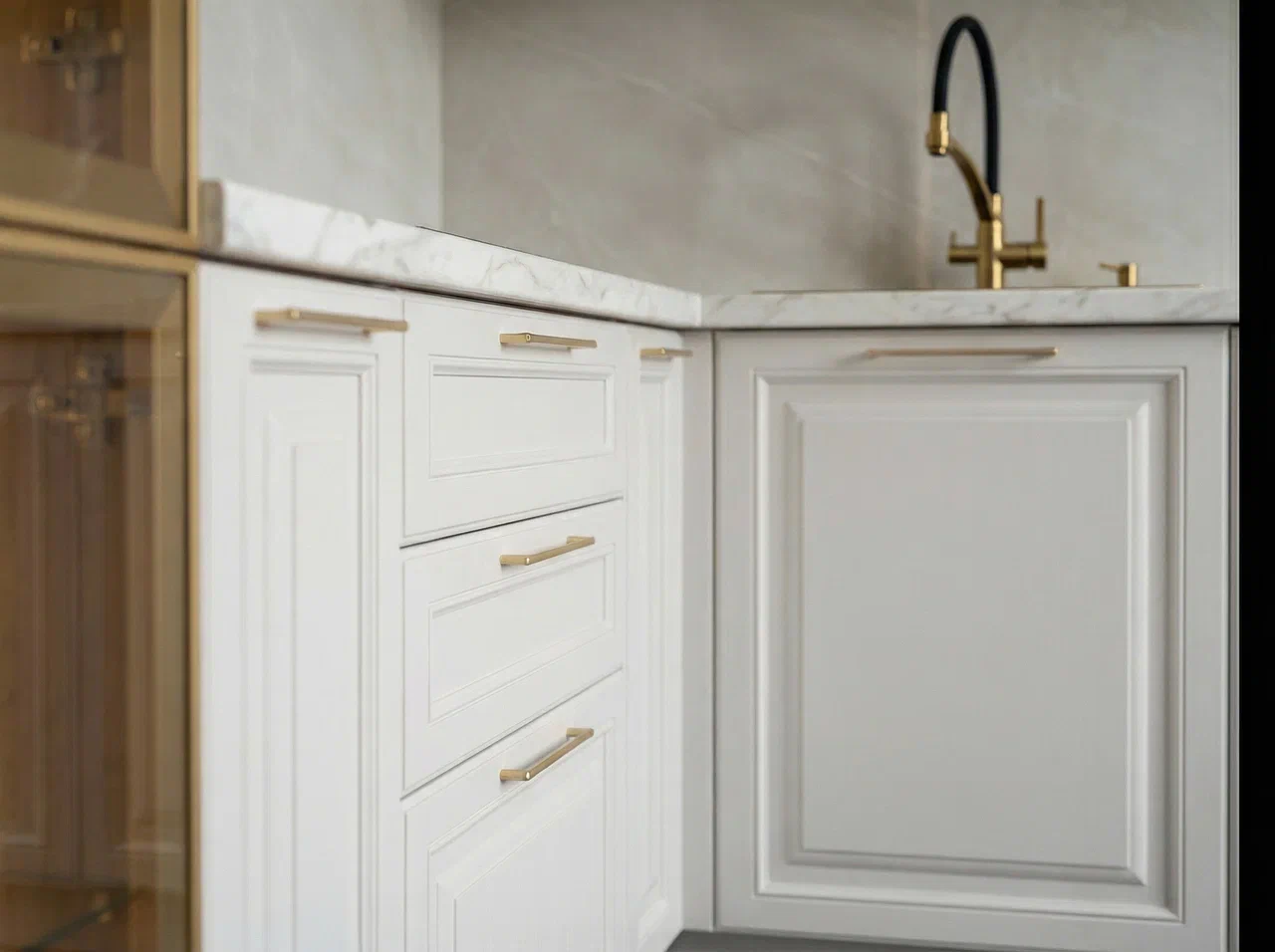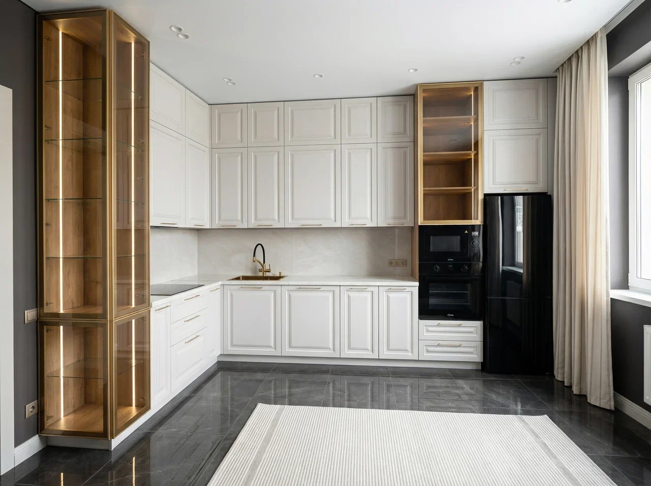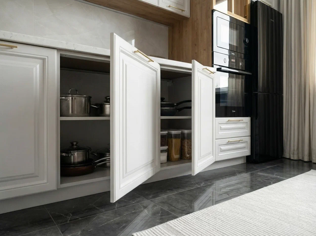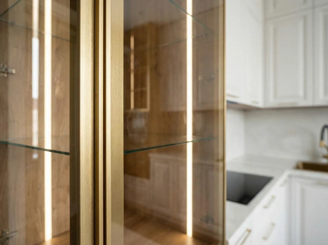 Фурнитура Boyard EVO с выкатными механизмами Тандембокс обеспечивает плавное и надёжное открытие шкафов. Кухня дополнена подсветкой витрины для функциональности и атмосферного светового акцента.