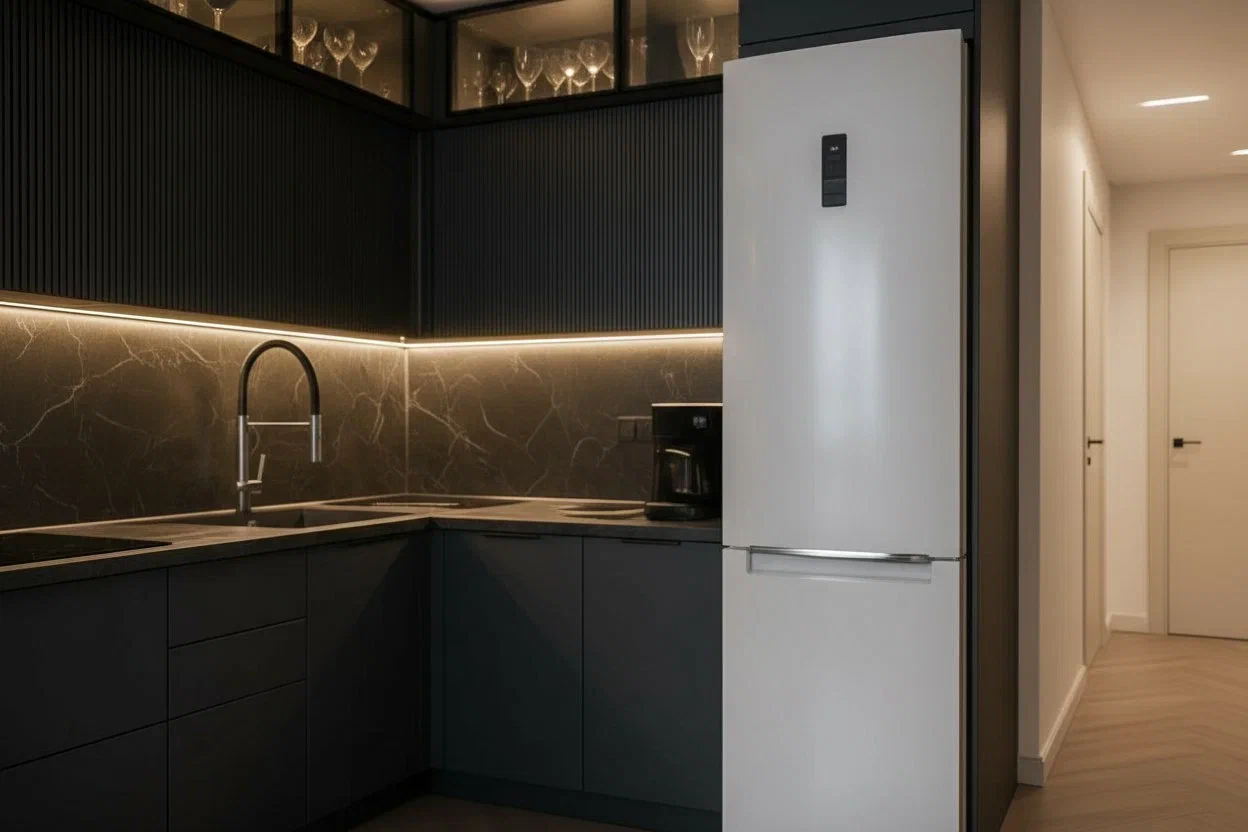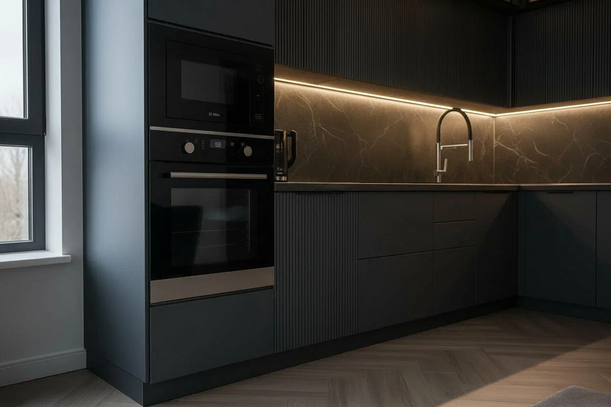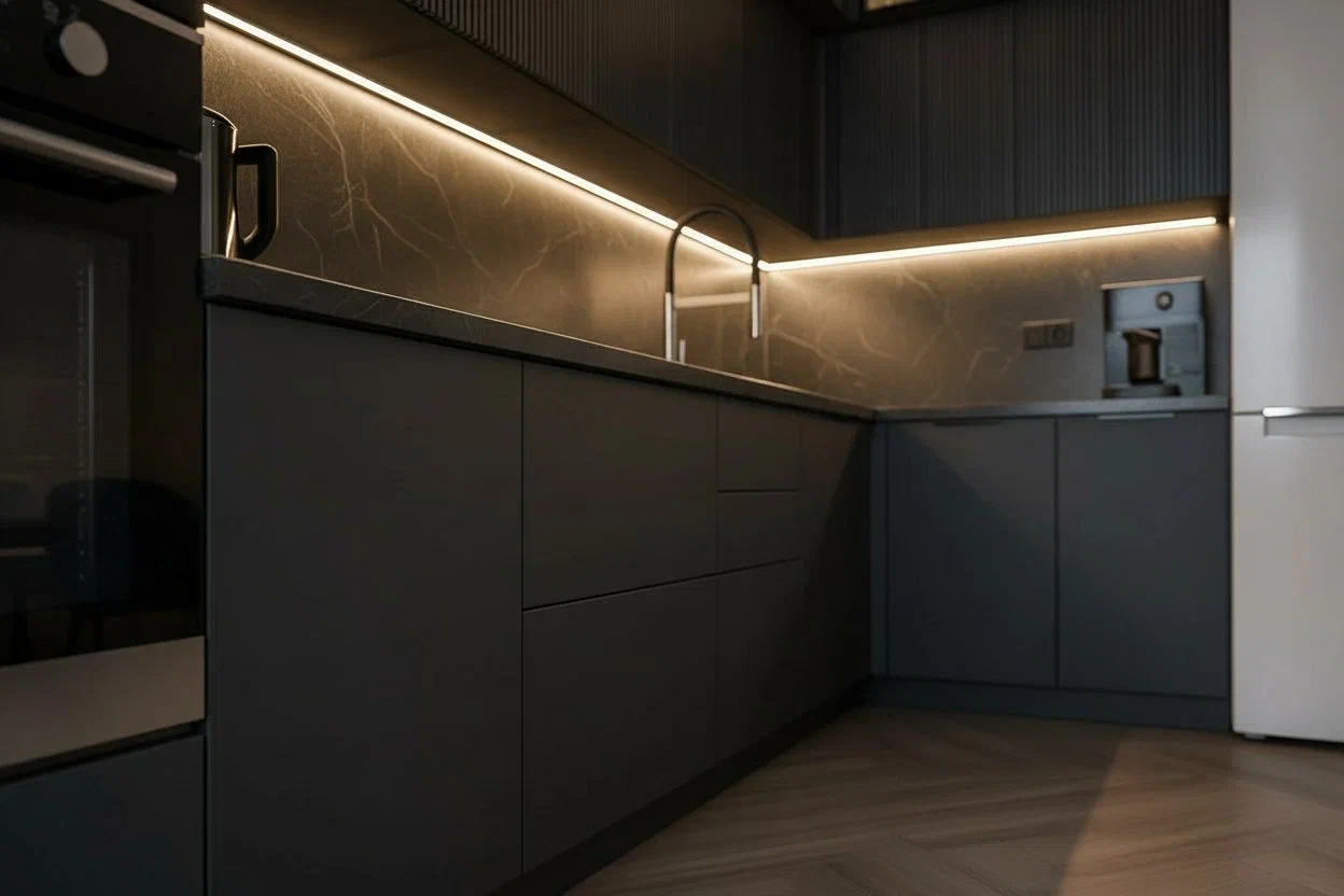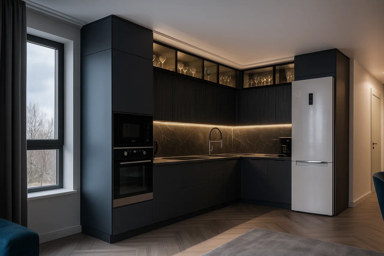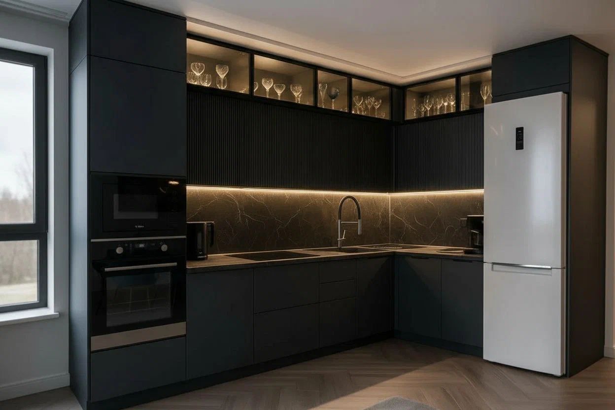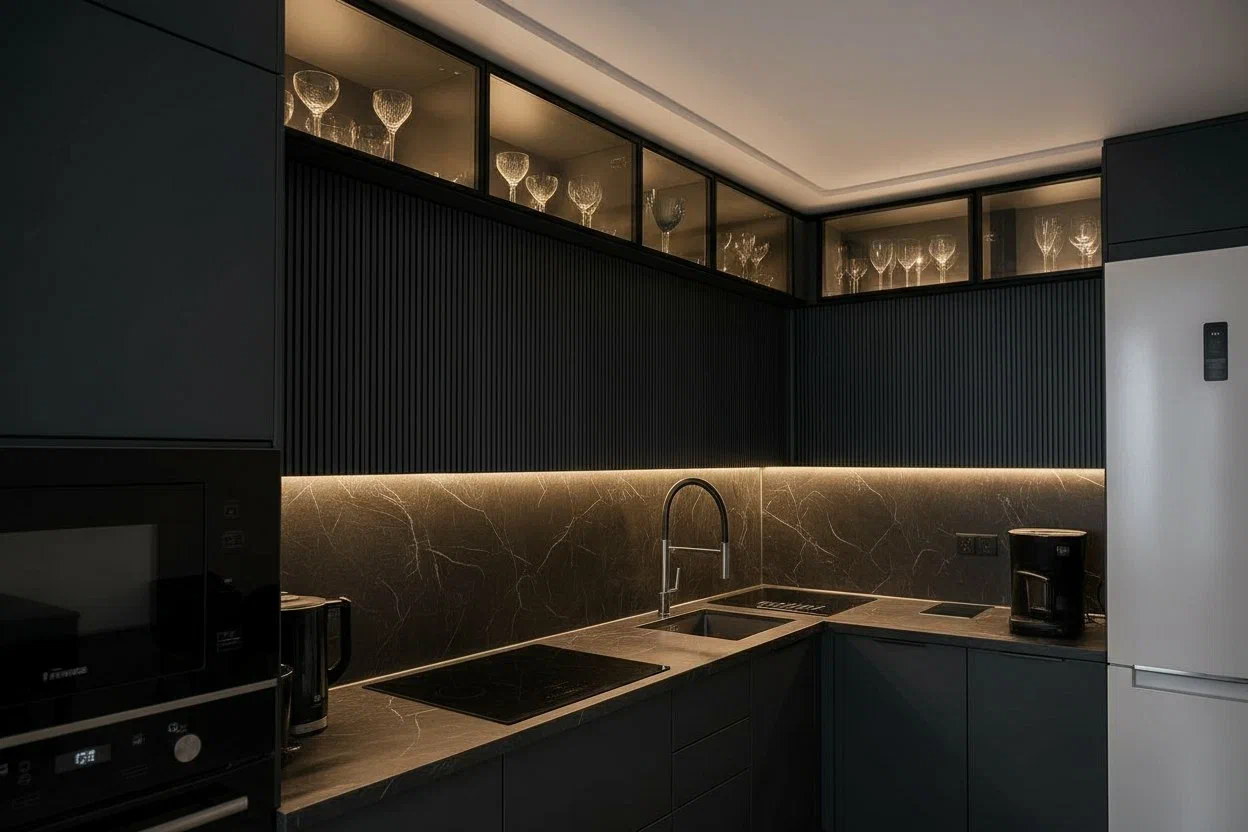 Фурнитура Boyard EVO с выкатными механизмами скрытого монтажа обеспечивает плавное и надёжное открытие шкафов. Кухня дополнена подсветкой витрины и рабочей зоны для комфорта и эффектного светового акцента.