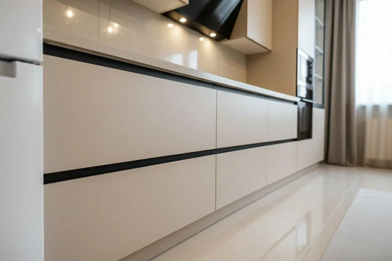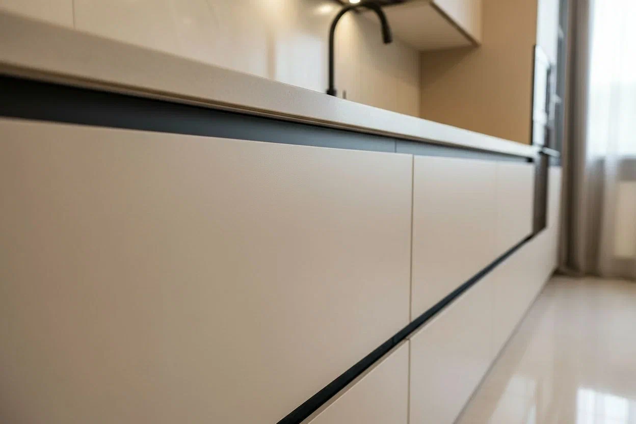Кухня в светлом оттенке Шарли Керамика с чистыми современными линиями и тёплым древесным акцентом. Фасады МДФ Kastamonu и корпус Увадрев Белый гармонично сочетаются со столешницей Скиф «Доминикана», создавая лёгкий и стильный интерьер.