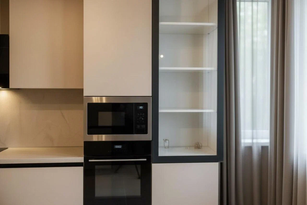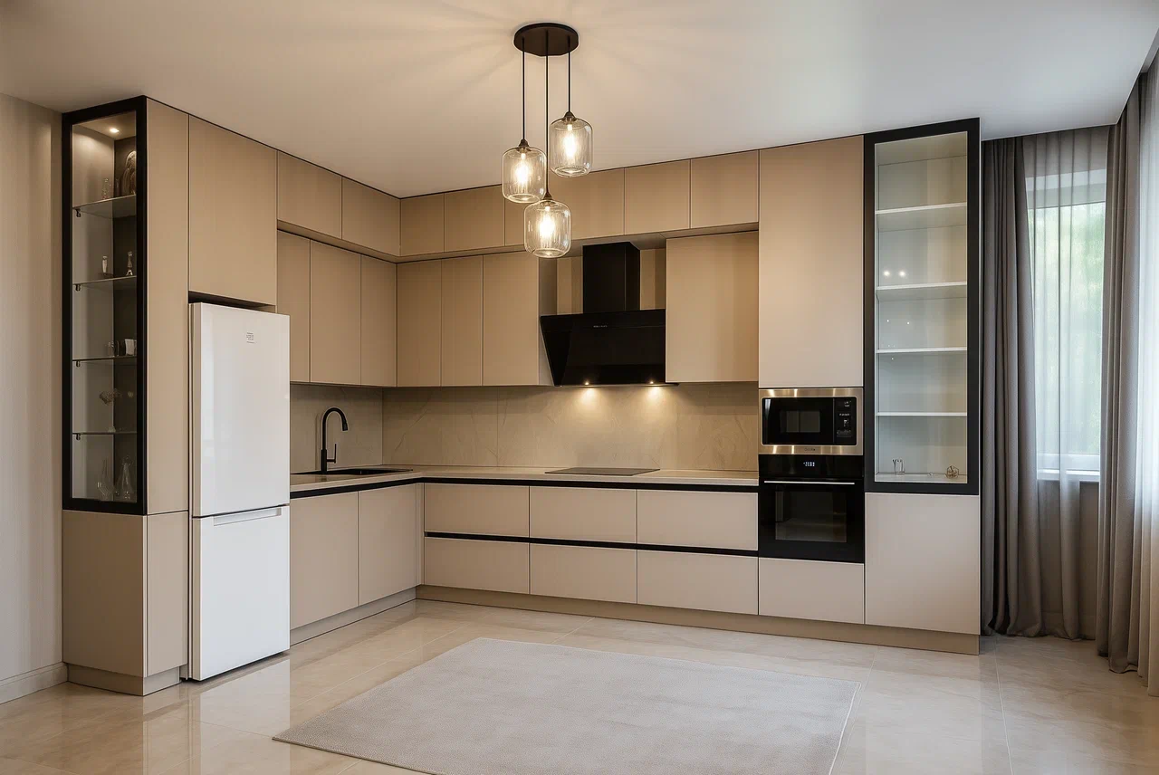 Фурнитура Blum с выкатными механизмами Тандембокс обеспечивает плавное и надёжное открытие шкафов. Кухня дополнена чёрной стальной мойкой, смесителем и подсветкой витрины для удобства и выразительного светового акцента.