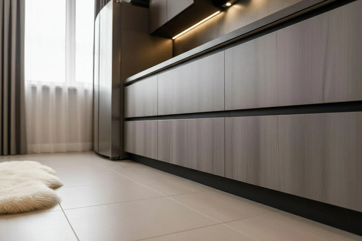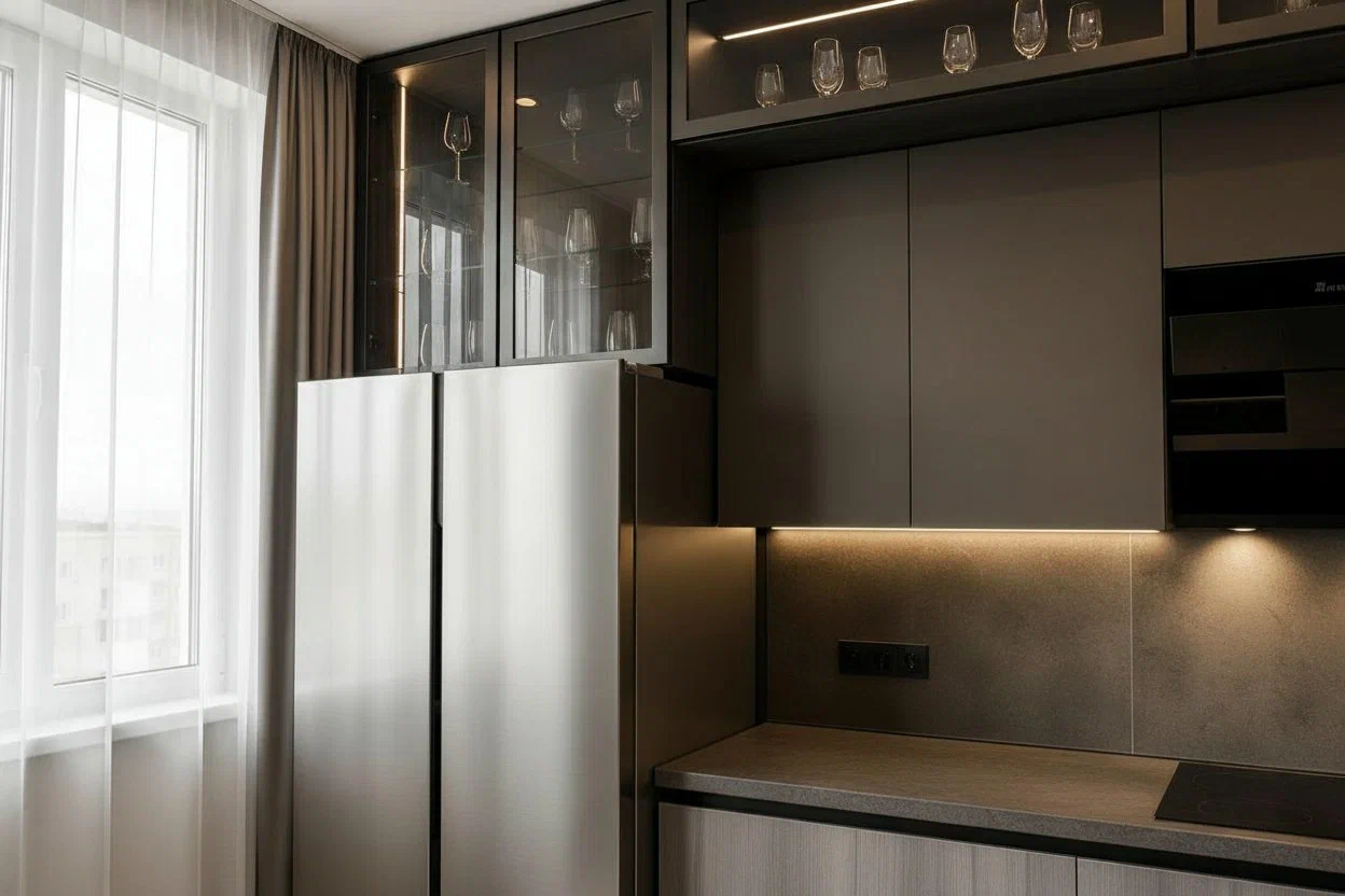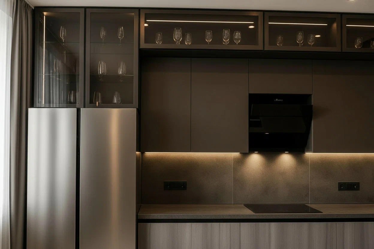 Фурнитура Boyard EVO с выкатными механизмами Тандембокс обеспечивает плавное и надёжное открытие шкафов. Кухня дополнена подсветкой витрины и рабочей зоны для удобства и эффектного светового акцента.