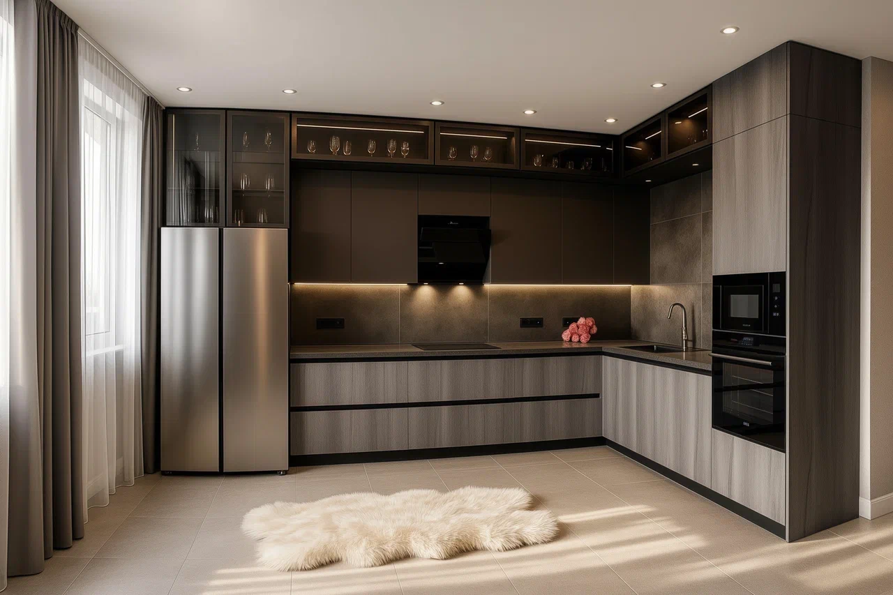 Кухня в контрастных оттенках Графит и Бруклин Серый с глубоким тёмным корпусом. Фасады МДФ Kastamonu и корпус Увадрев Тёмно-Серый гармонично сочетаются со столешницей из кварца Radianz Characoal, создавая современный и выразительный интерьер.