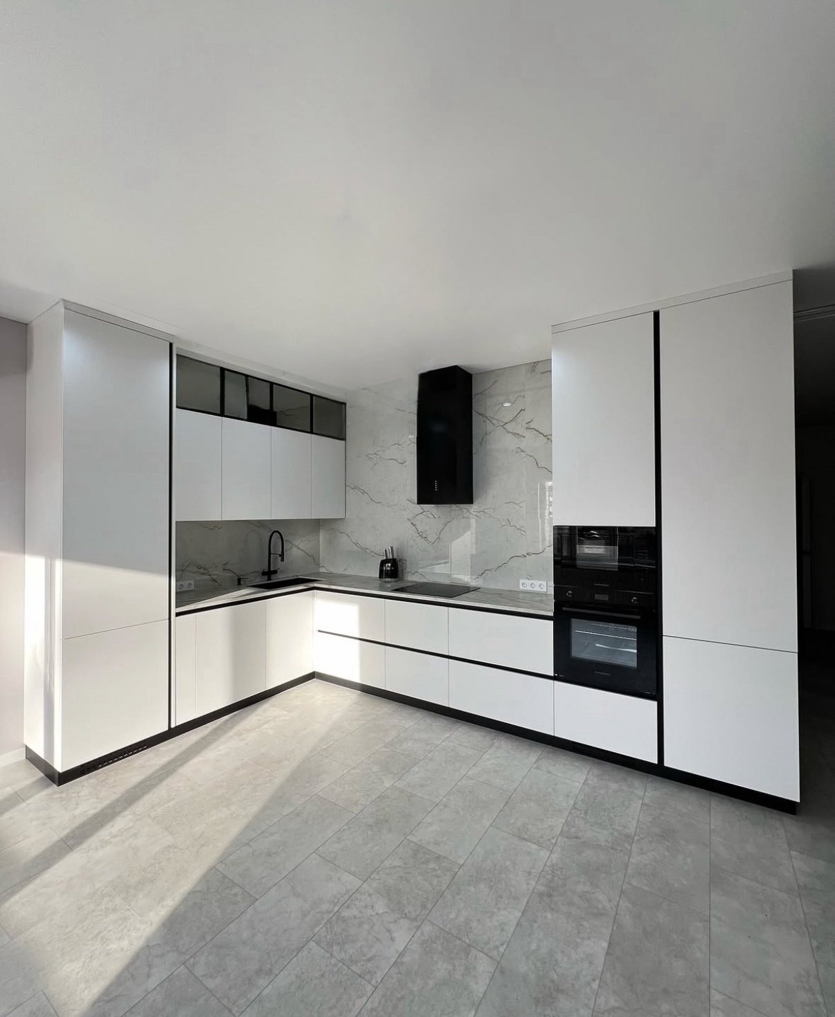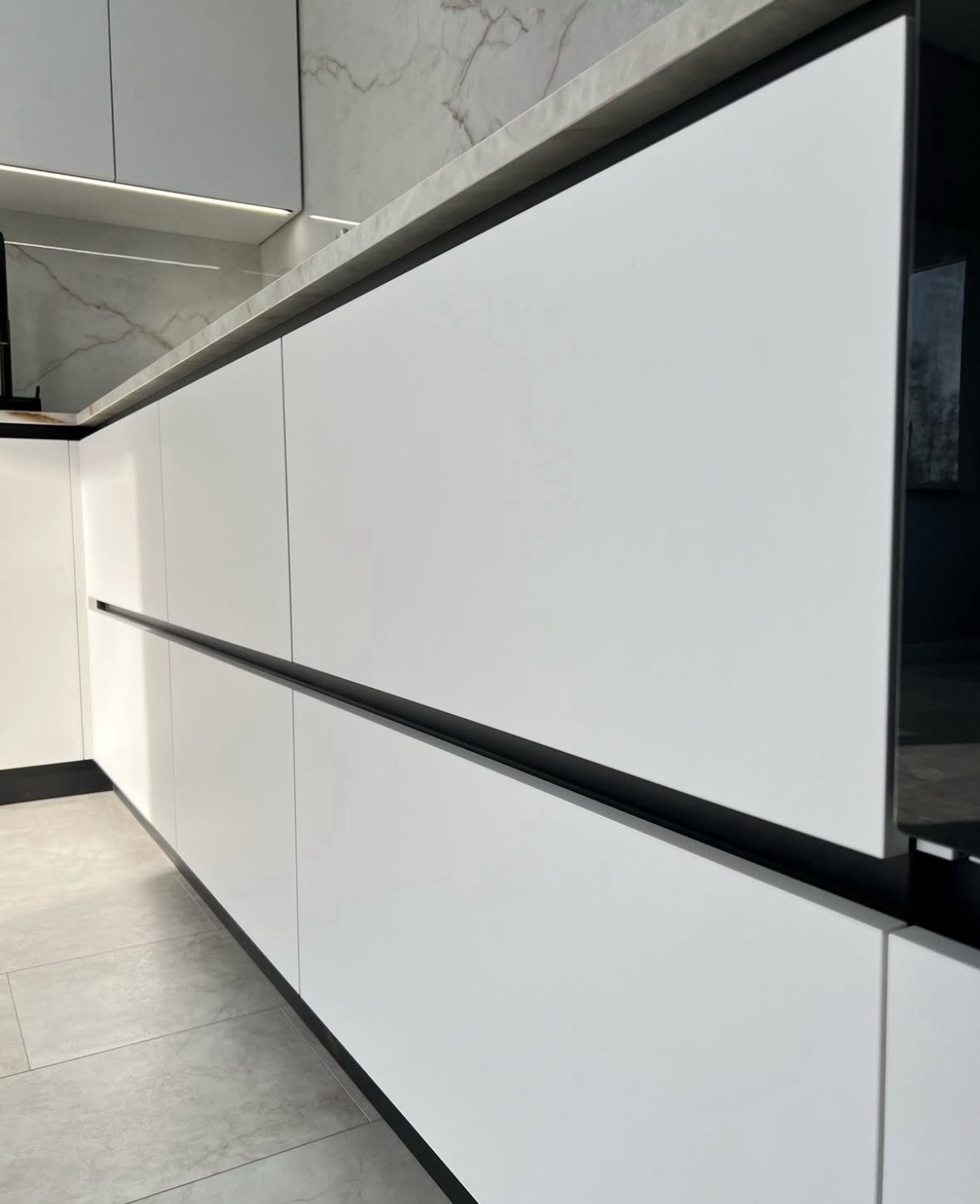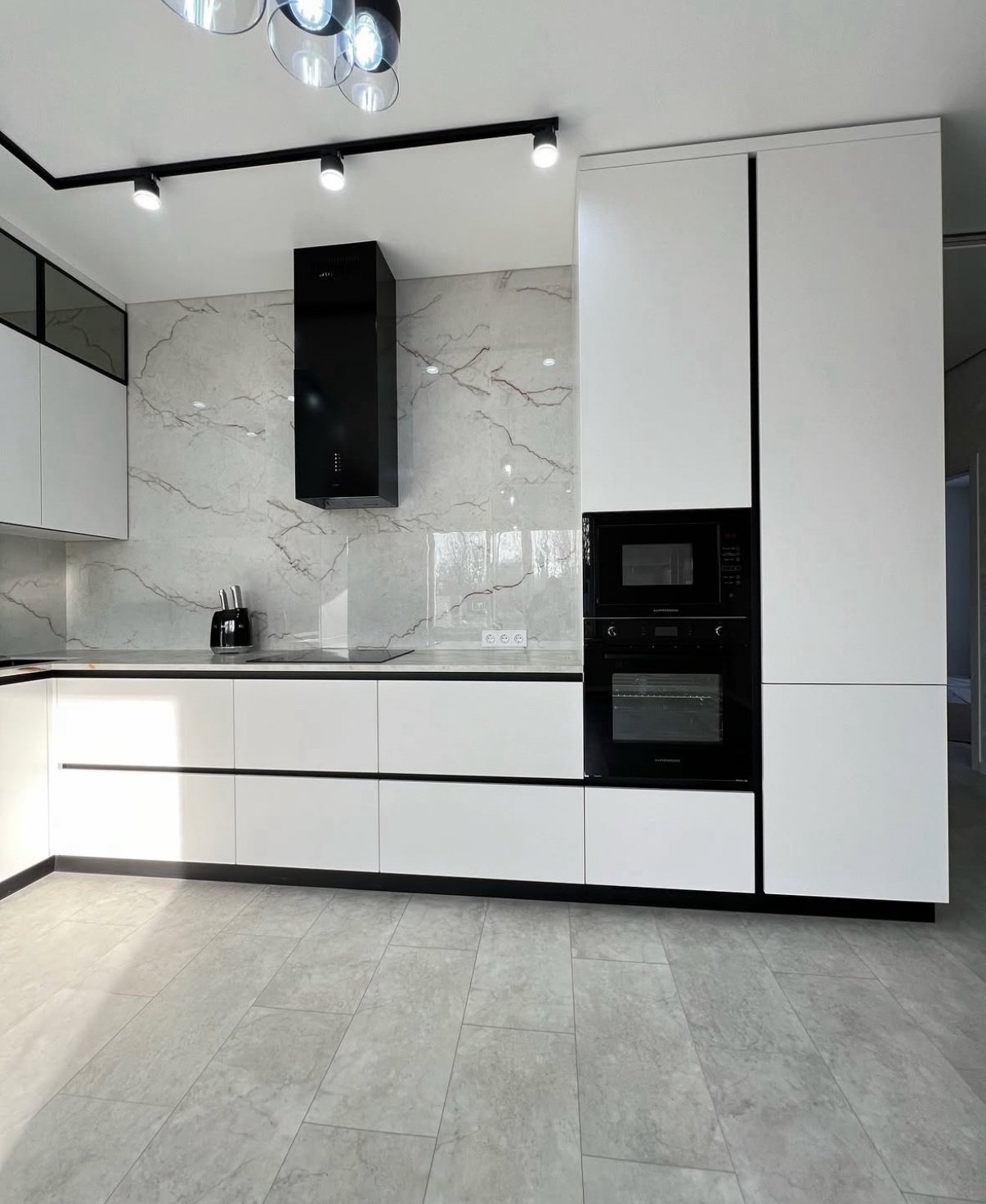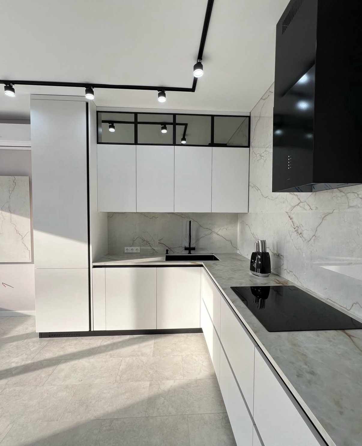 Современная кухня в сияющем белом цвете с выразительными чёрными деталями. Фасады МДФ Kastamonu и корпус Увадрев Белый идеально гармонируют со столешницей из акрила Grandex Carrara Lunar, создавая свежий и стильный интерьер.