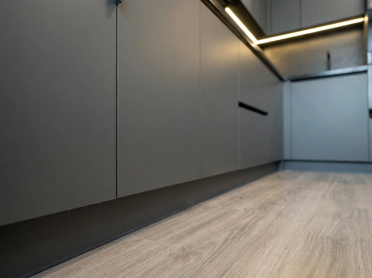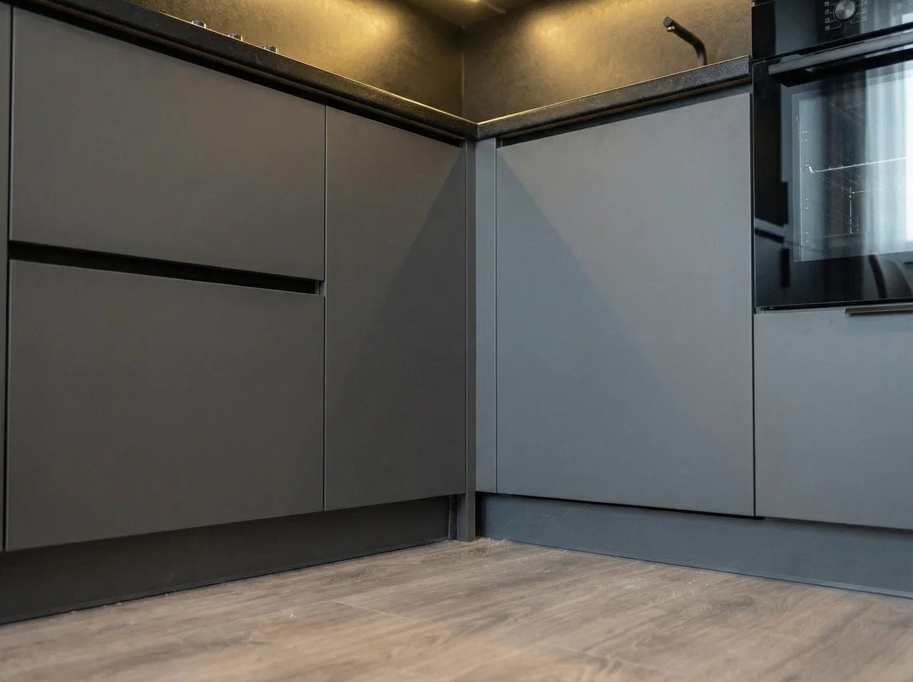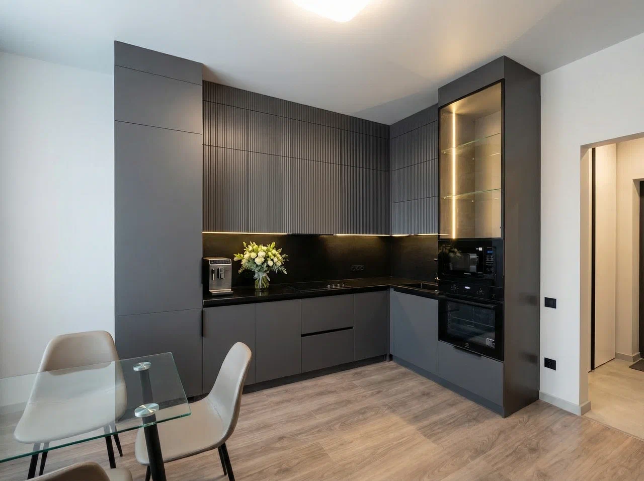 Чёрный профиль Gola, тонкая алюминиевая рамка и стекло с чёрной тонировкой подчёркивают строгую геометрию и минималистичный характер кухни.