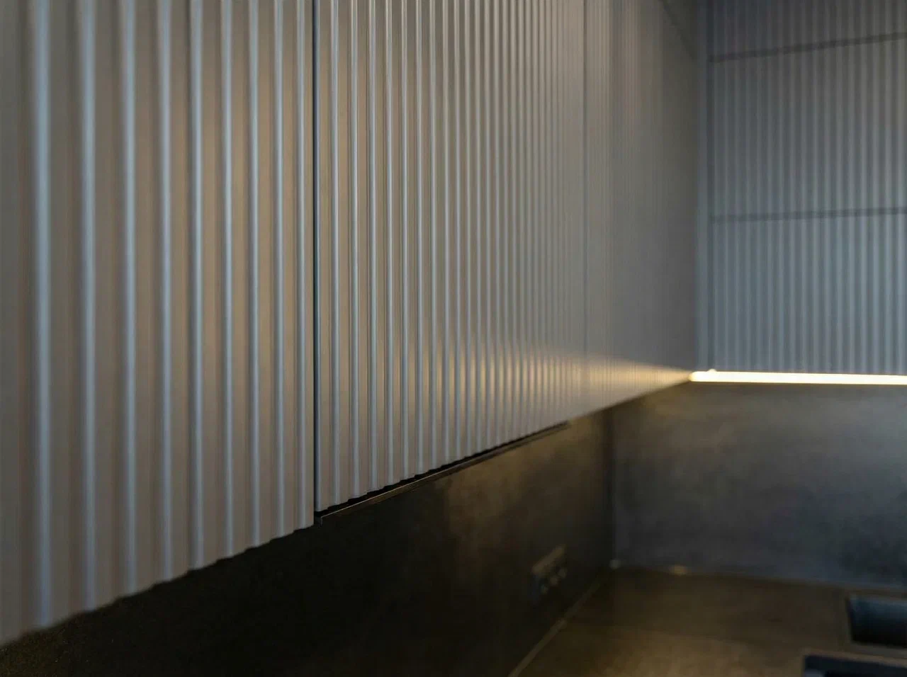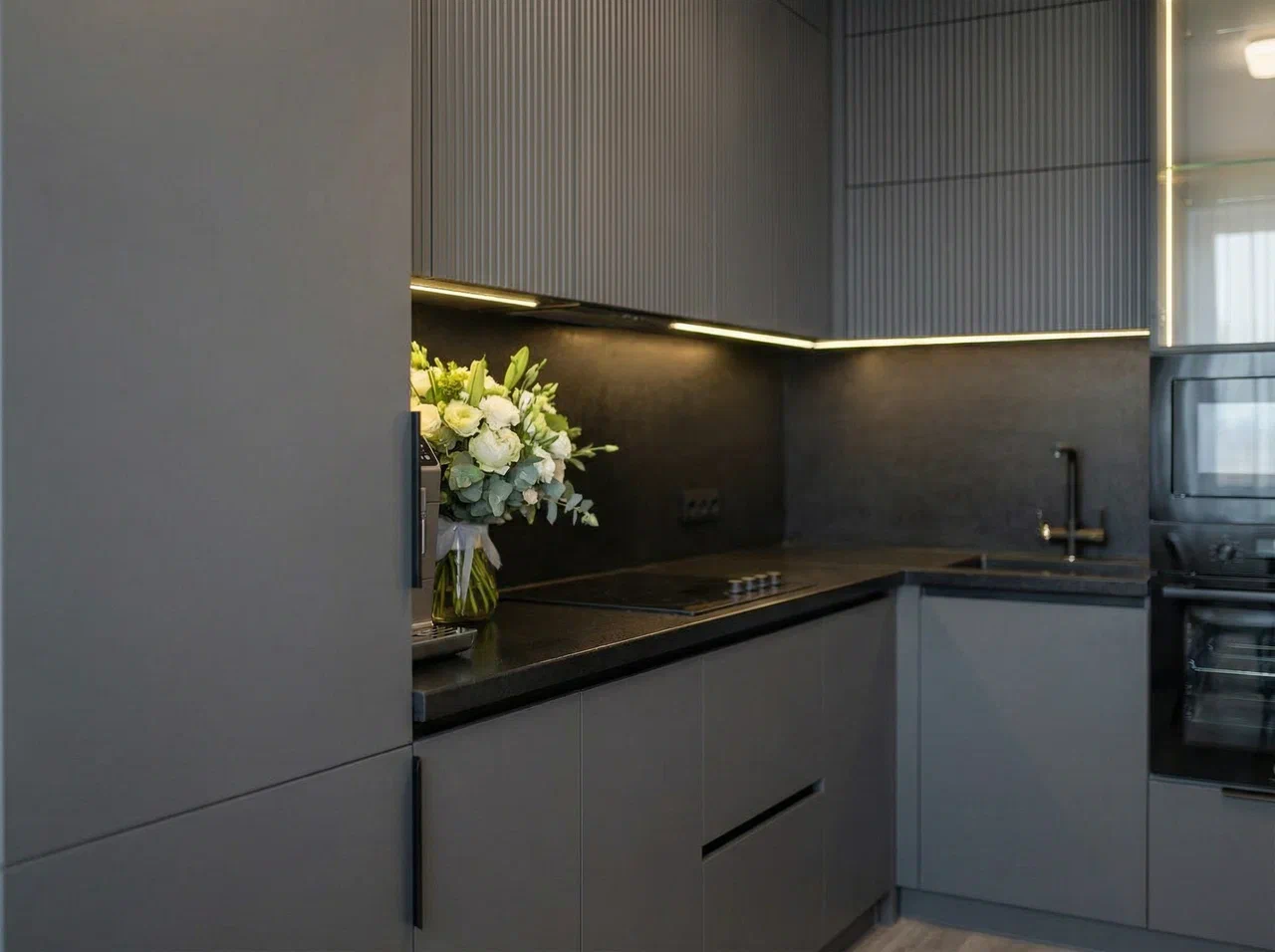 Фурнитура Boyard EVO и выкатные механизмы Тандембокс в сером цвете обеспечивают плавную и надёжную работу шкафов. Кухня дополнена чёрной стальной мойкой, смесителем и подсветкой витрины и рабочей зоны для функциональности и атмосферного акцента.