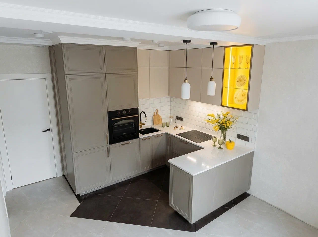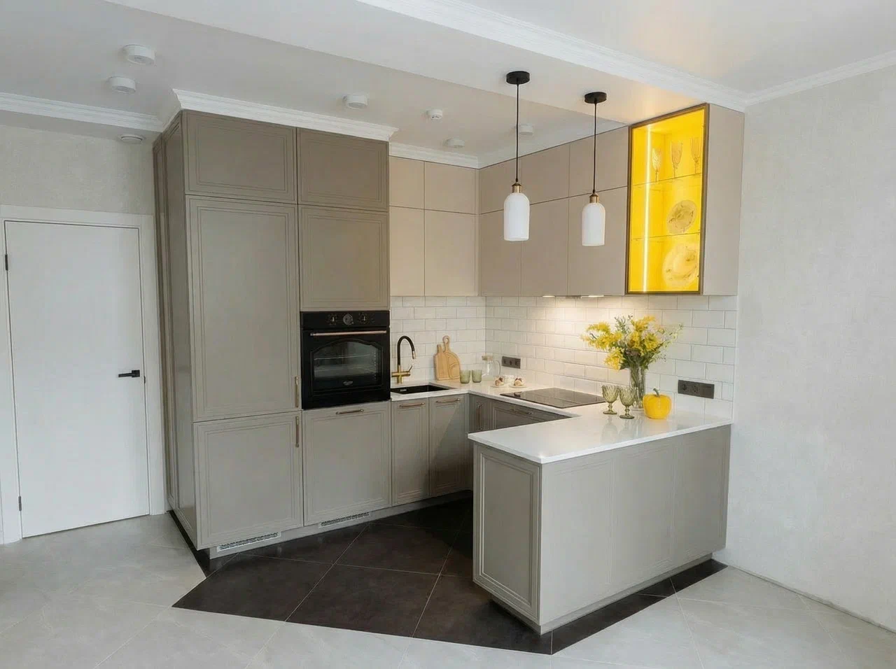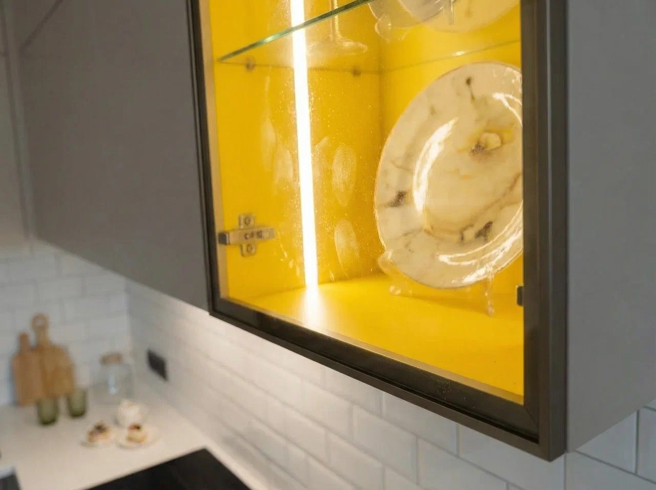 Фурнитура Alphalux с выкатными механизмами обеспечивает плавное и надёжное открытие шкафов. Кухня дополнена подсветкой витрины для удобства и стильного светового акцента.