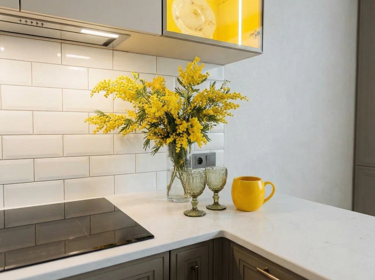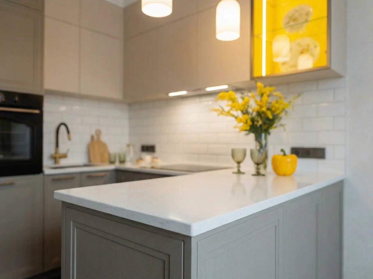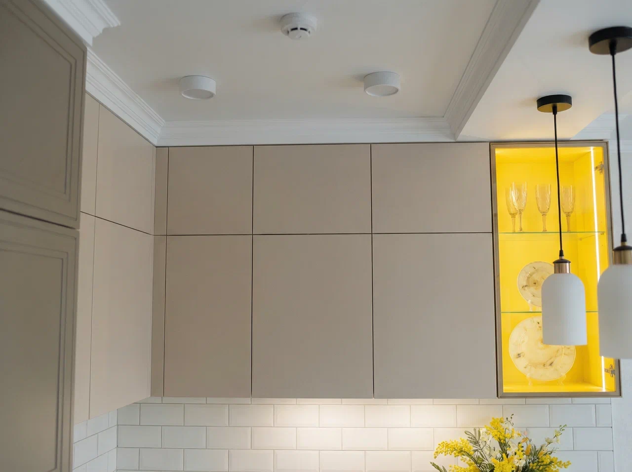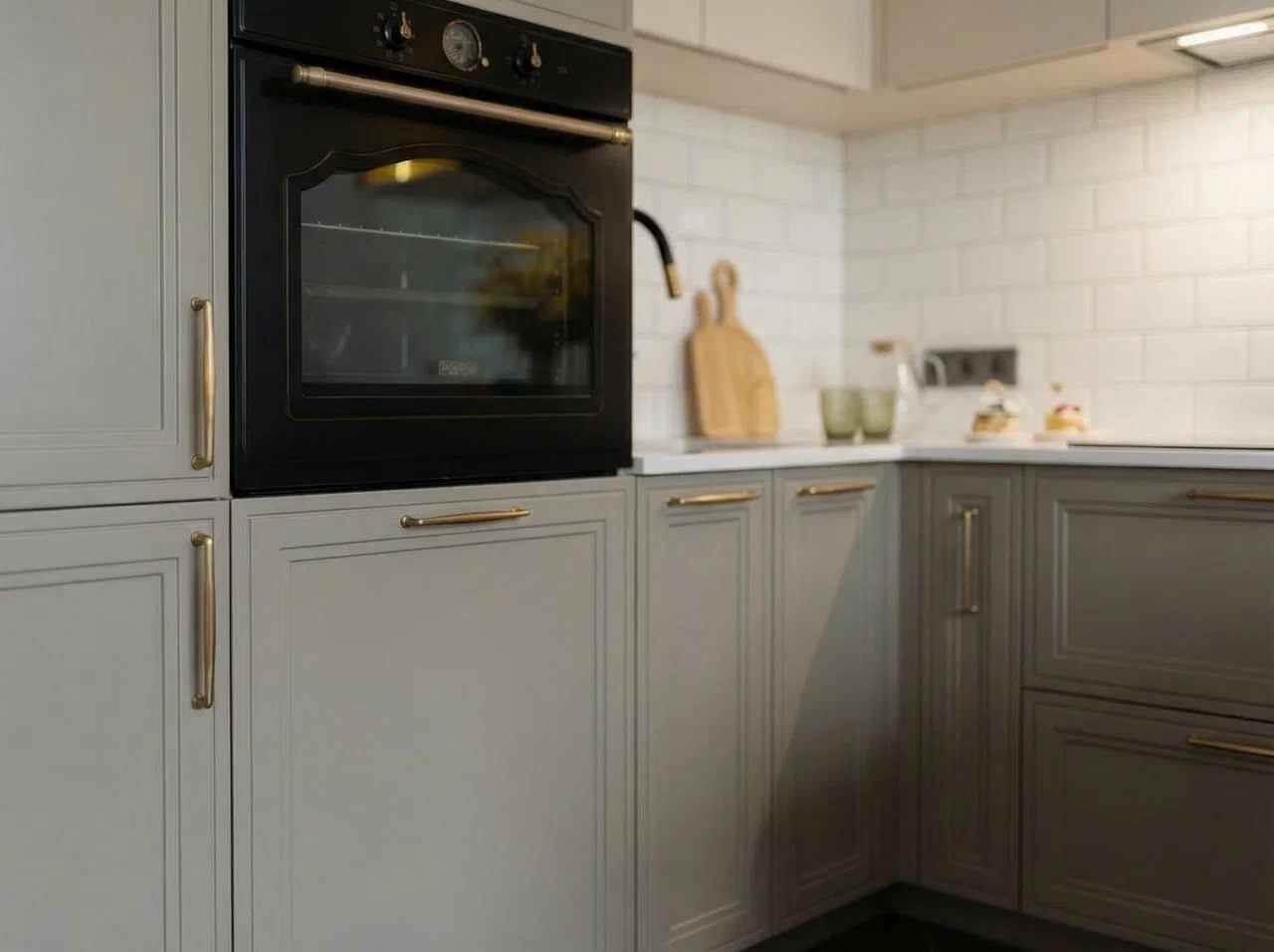 Фурнитура Alphalux с выкатными механизмами обеспечивает плавное и надёжное открытие шкафов. Кухня дополнена подсветкой витрины для удобства и стильного светового акцента.