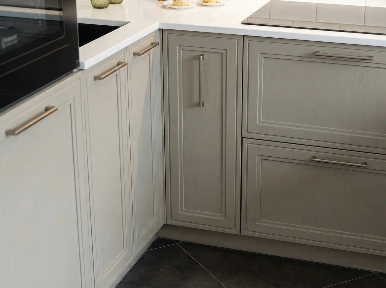 Кухня в сочетании оттенков Кашемир и Керамика с мягкими светлыми акцентами. Фасады МДФ Kastamonu и корпус Увадрев Белый гармонично дополняются столешницей Скиф «Бриллиант Белый», создавая лёгкий и элегантный интерьер.
