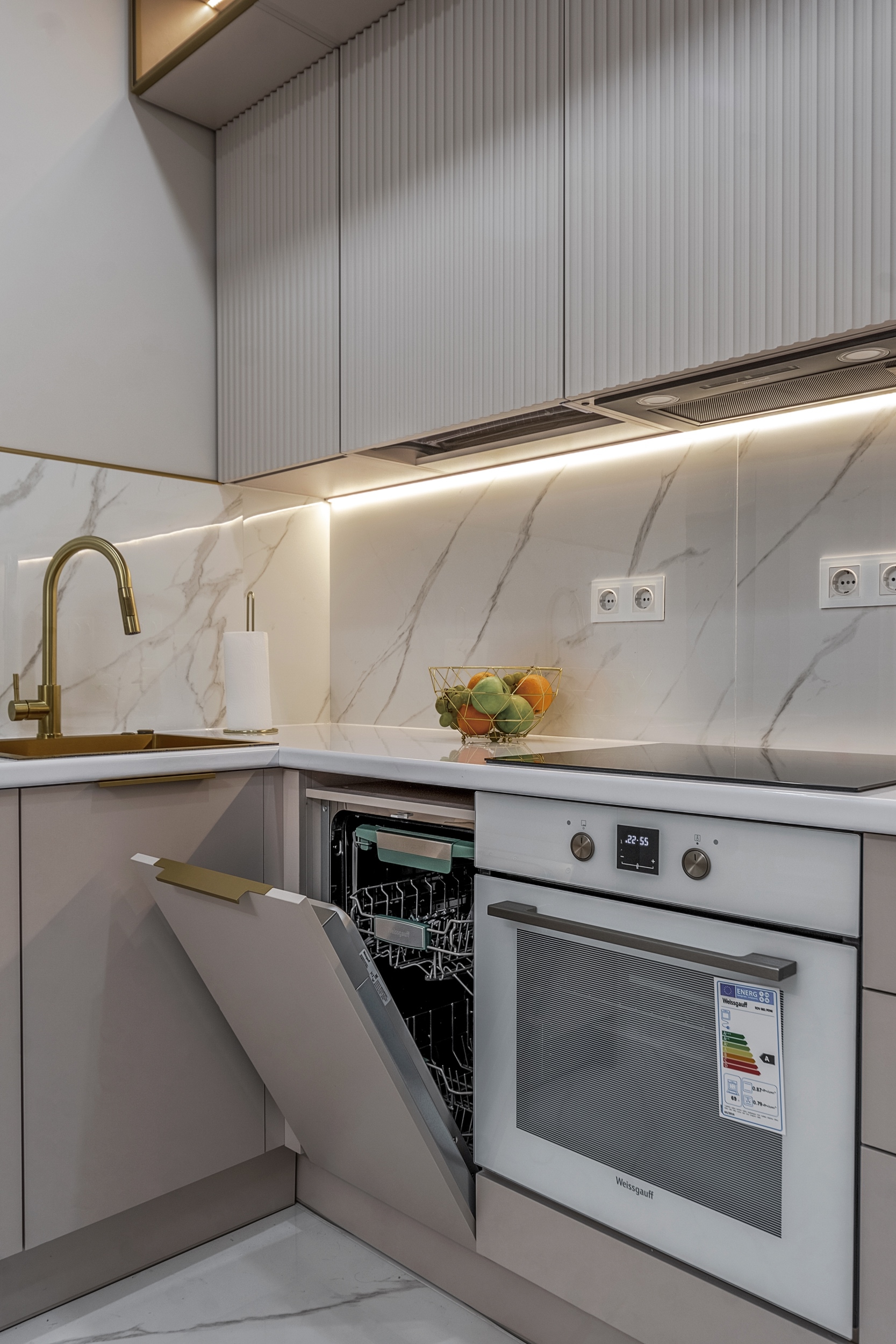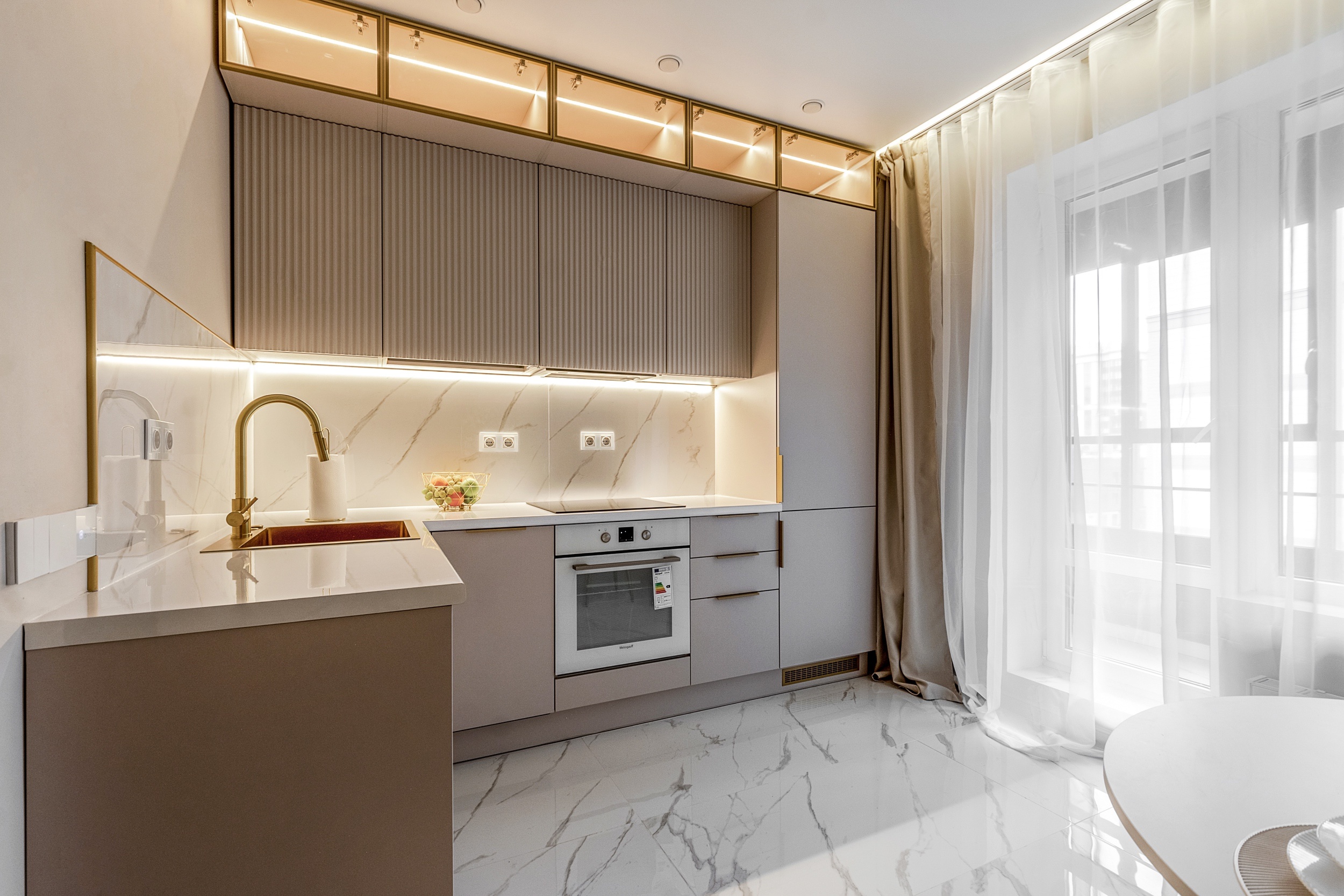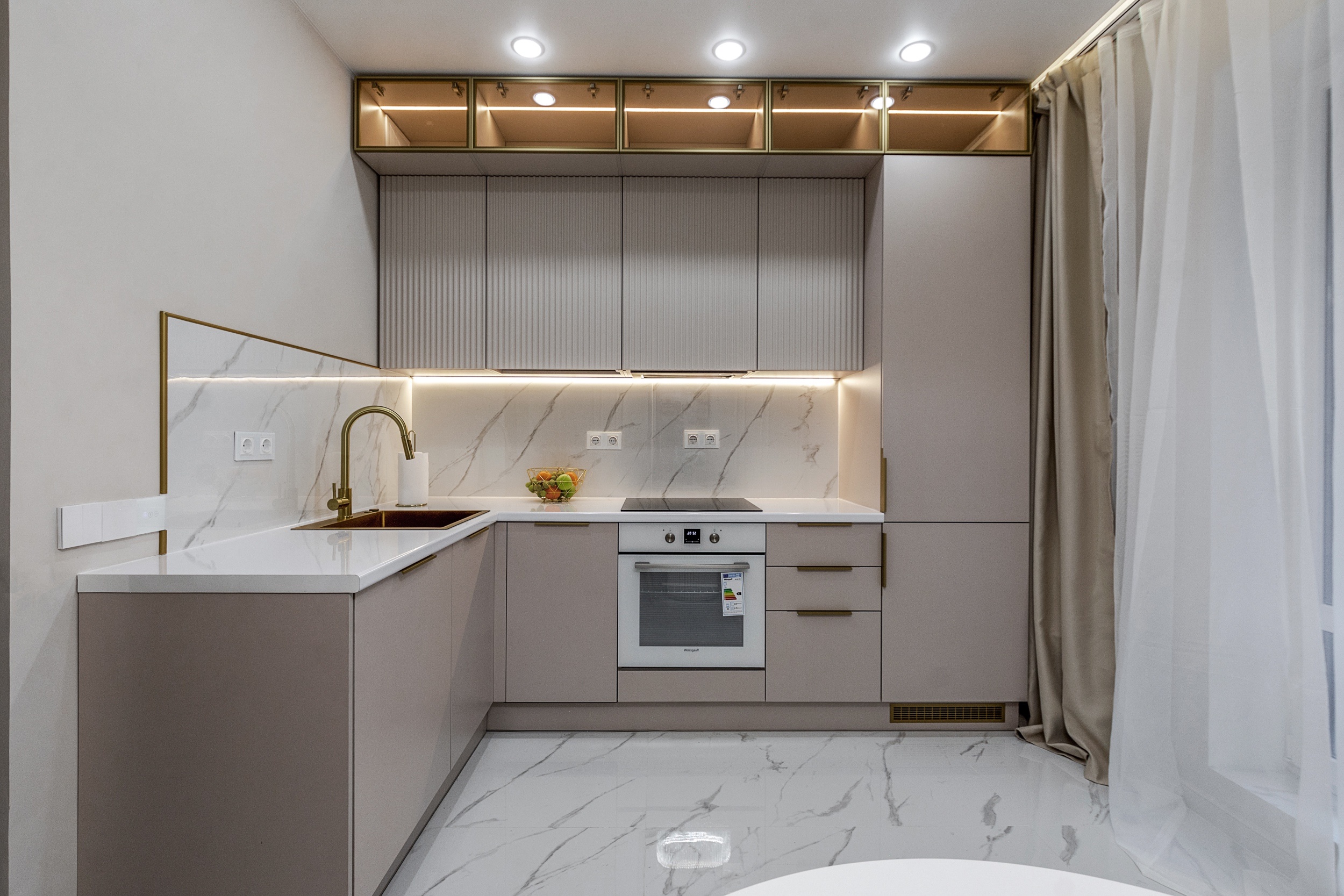 Фурнитура Boyard EVO со скрытыми выкатными механизмами обеспечивает плавное и надёжное открытие шкафов. Кухня дополнена подсветкой витрины и рабочей зоны для функциональности и эффектного светового акцента.