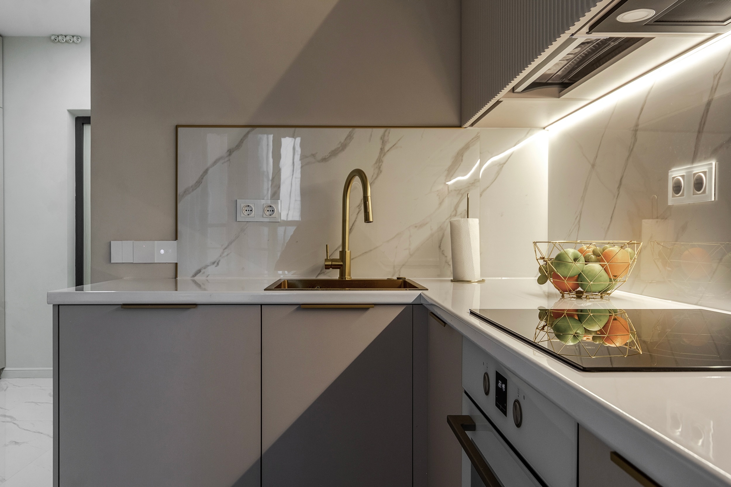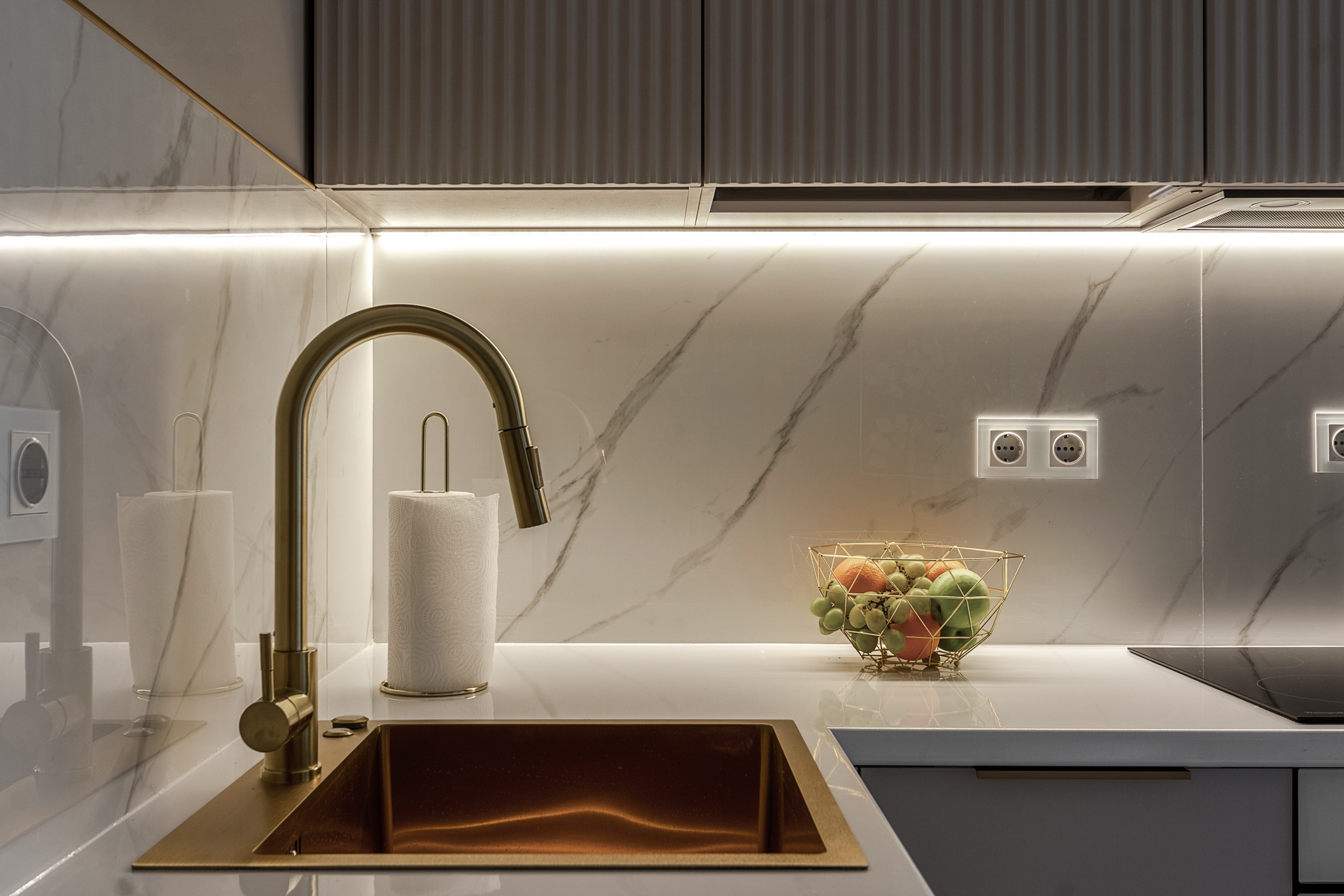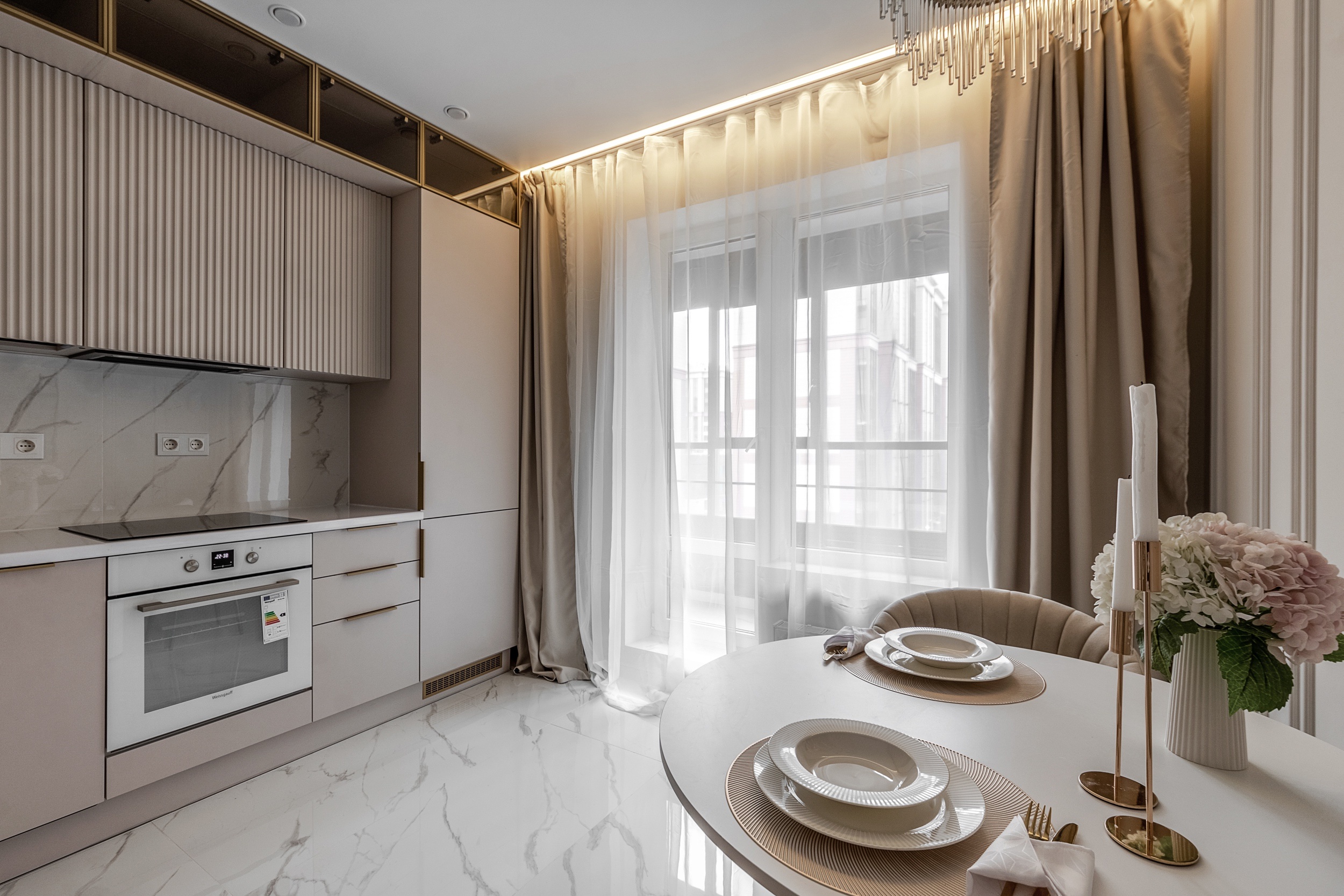 Фурнитура Boyard EVO со скрытыми выкатными механизмами обеспечивает плавное и надёжное открытие шкафов. Кухня дополнена подсветкой витрины и рабочей зоны для функциональности и эффектного светового акцента.
