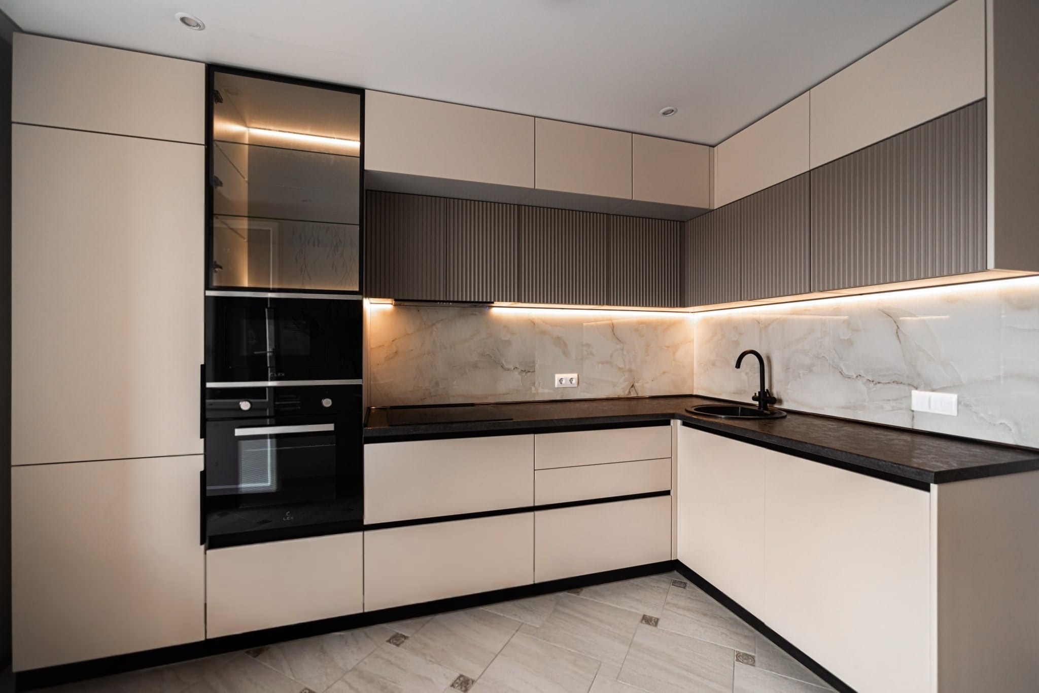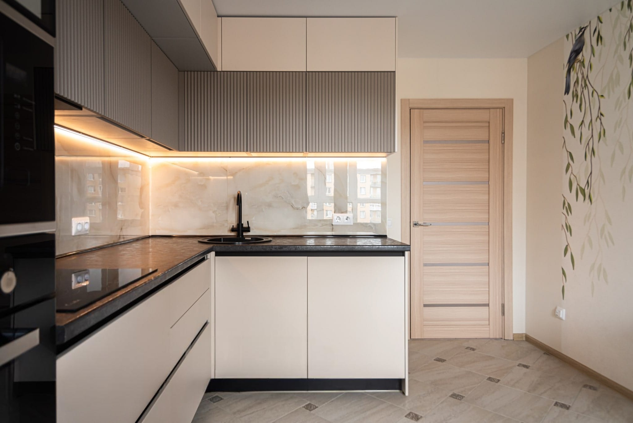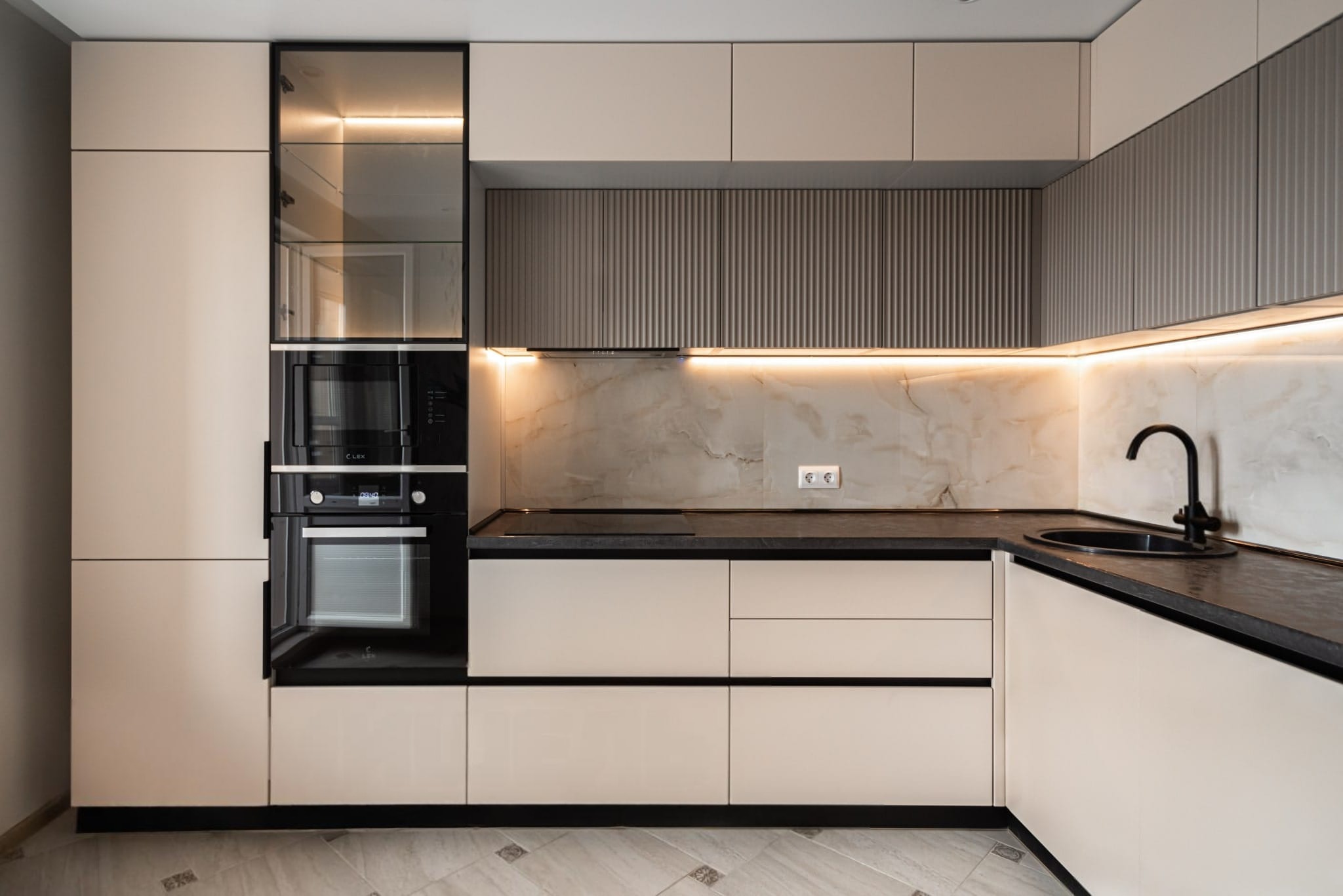 Кухня в мягком оттенке Крем с контрастными чёрными акцентами. Фасады МДФ Kastamonu и корпус Увадрев Белый гармонично сочетаются с чёрной столешницей, создавая современный и стильный интерьер.