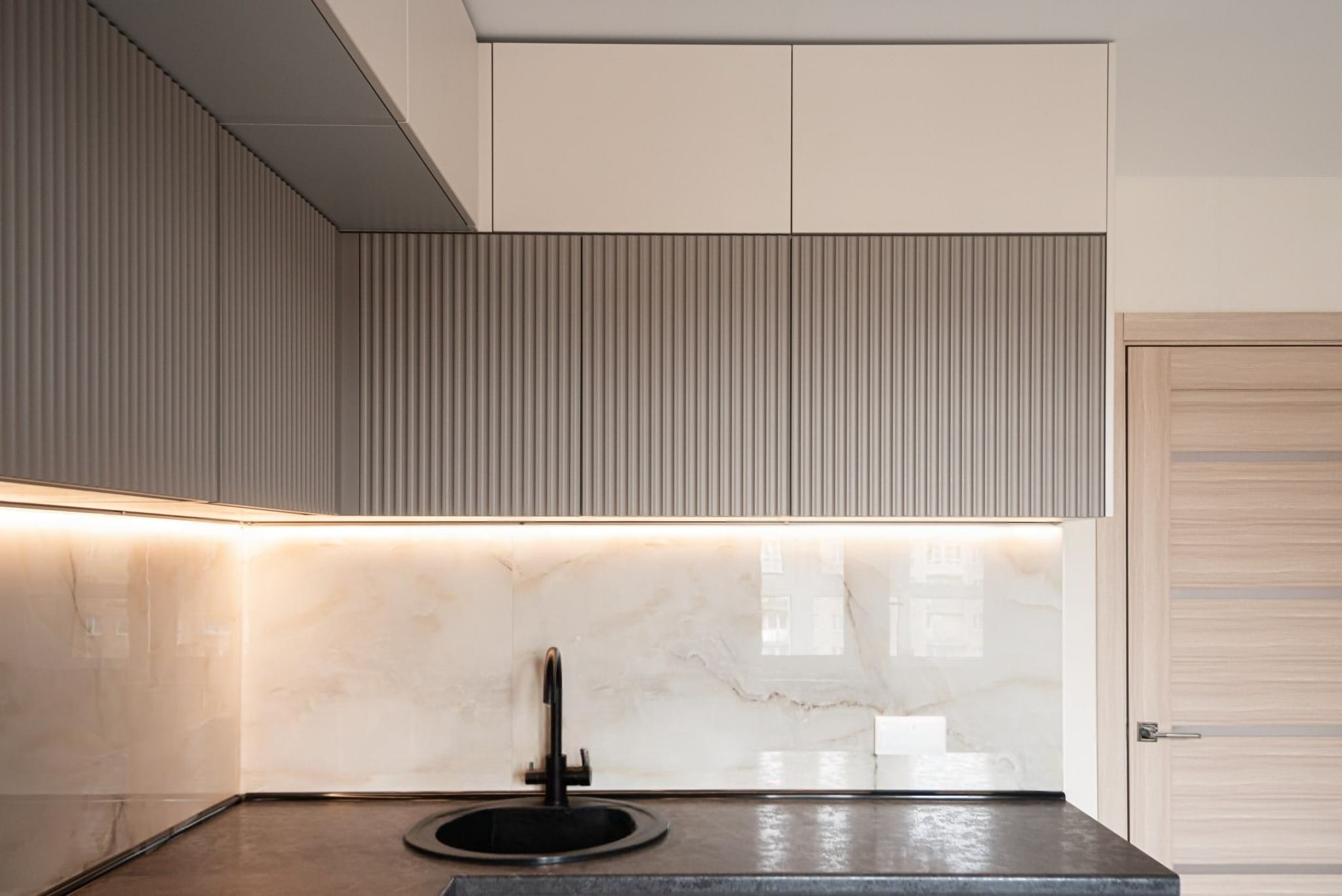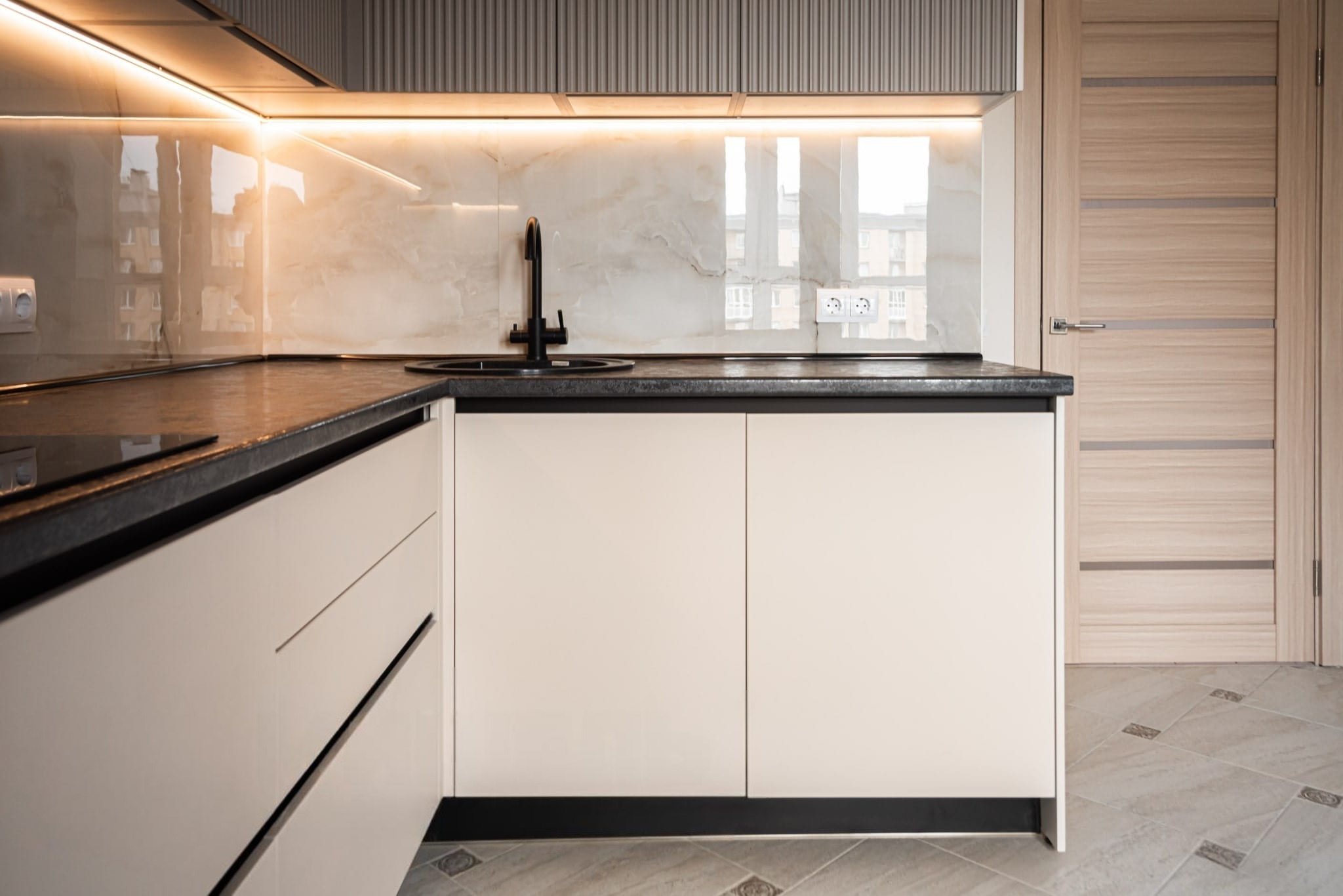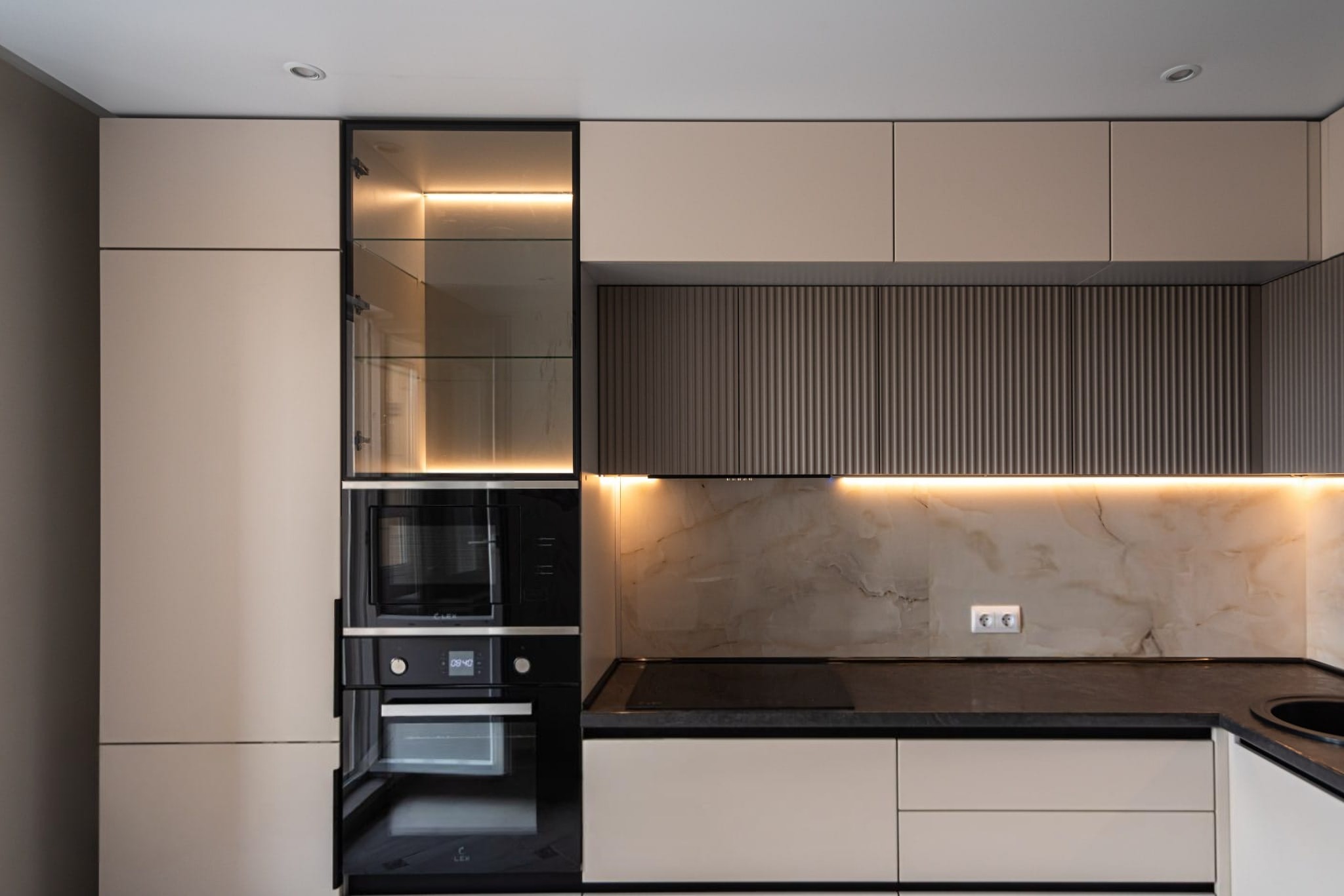 Кухня в мягком оттенке Крем с контрастными чёрными акцентами. Фасады МДФ Kastamonu и корпус Увадрев Белый гармонично сочетаются с чёрной столешницей, создавая современный и стильный интерьер.